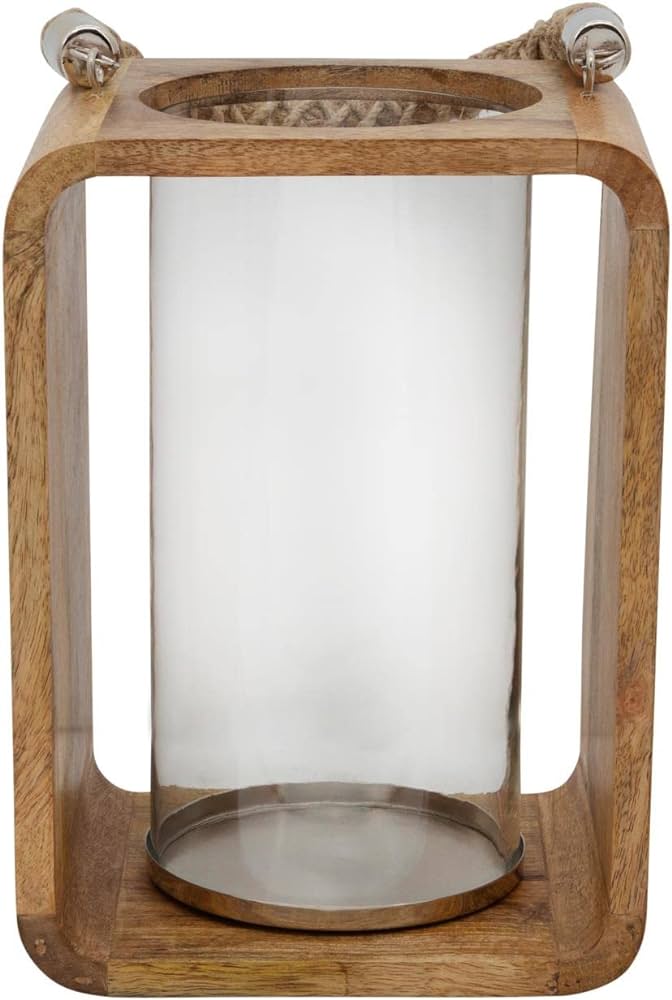 Embrace the rustic elegance of this 12-inch wooden hurricane lantern. Its natural wood frame and rope handles exude a cozy ambiance, while the clear glass cylinder showcases the warm glow of pillar candles or tealights. Imagine this lantern gracing your dining table, casting a soft, inviting light that sets the mood for intimate gatherings. Or picture it nestled on a porch railing, adding a touch of warmth and charm to your outdoor space. This versatile lantern is crafted from metal for lasting durability, ensuring it becomes a cherished accent piece in your home for years to come.