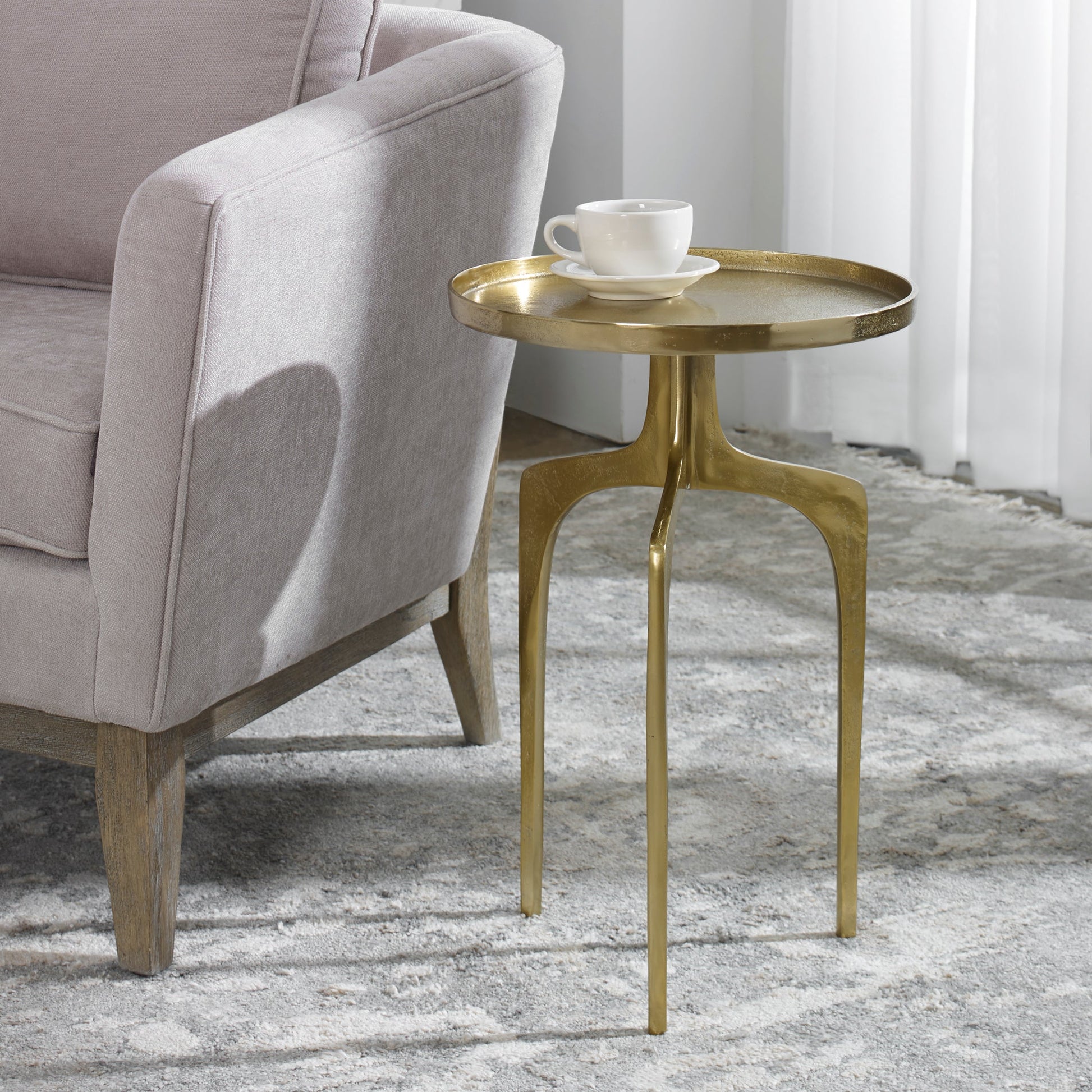 Details & OverviewThe unique design of this accent table features three curved legs and a solid round top, which is accented with a .75" raised lip. This cast aluminum table is finished in a slightly textured soft gold. Perfect beside your favorite chair! Also available in