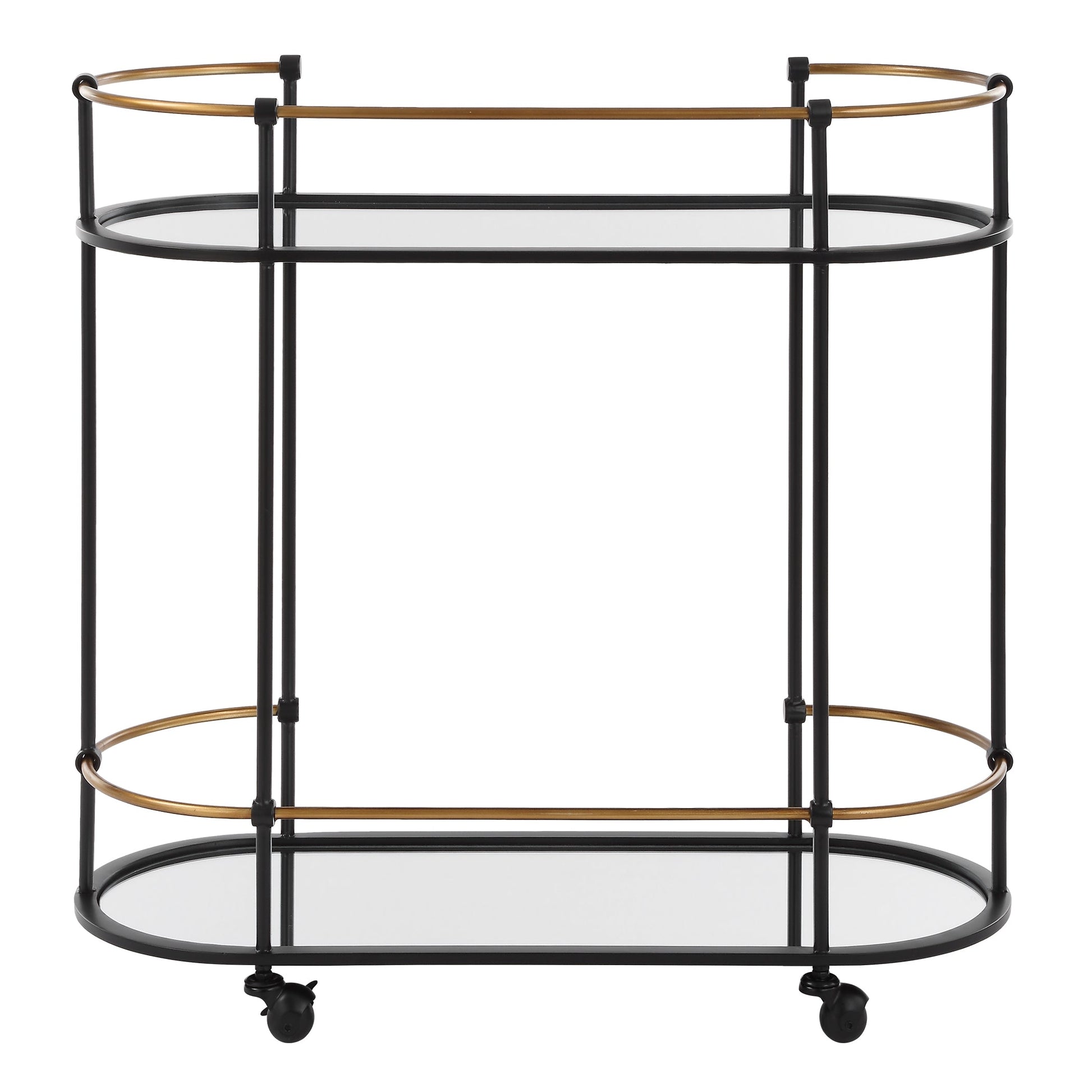 Highlighting A Clean Pill Shaped Design This Bar Cart Brags Of Satin Black Finished Iron Legs Accenting Its Antique Gold Features. Two Plain Mirrored Shelves Act As Stylish Space For Your Favorite Glasses And Sprits. Complete With Rolling And Locking Casters.