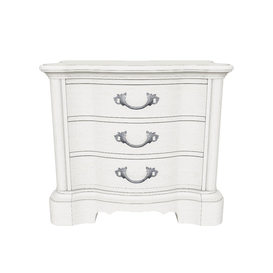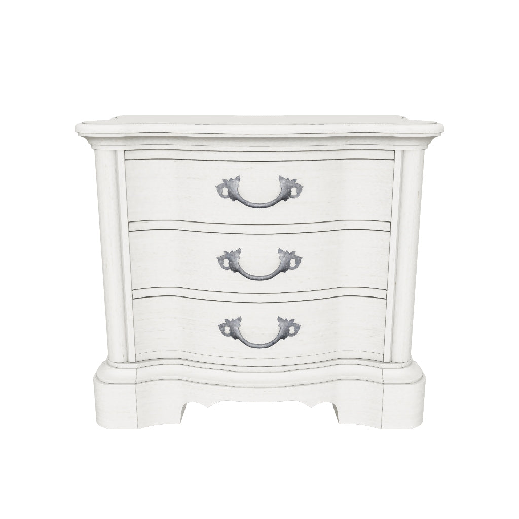 Add a touch of romance to your bedroom with the Arlendyne nightstand. Its antiqued white painted finish and serpentine-shaped silhouette are the definition of easy elegance. The nightstand's three spacious drawers accommodate bedside essentials, while an integrated power outlet and USB charging keep up with your high-tech lifestyle.