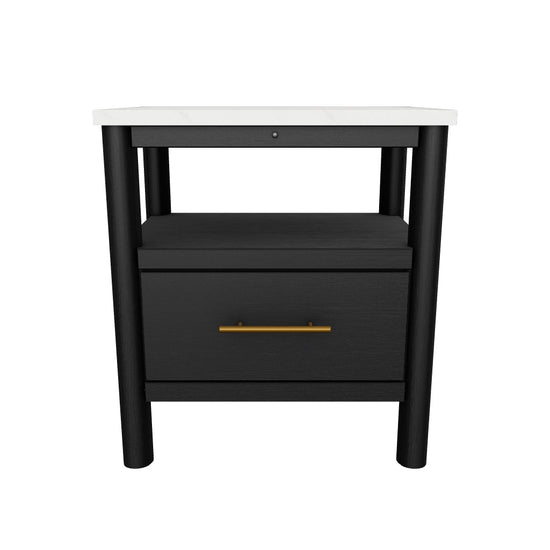 One Drawer Night Stand,,Made with engineered wood (MDF/particleboard/plywood) and decorative laminate for the right balance of affordability and durability;Matte black finish with subtle replicated wood grain;Replicated white marble top;Decorative laminate replicates natural or man-made material surfaces with consistent color, pattern and texture;Handles with light bronze-tone finish;1 smooth-gliding drawer;Drawer interior is lined with a faux linen laminate for a clean, finished look;Open shelf;USB and Qi wireless charging options;Ambient lighting under the top;Power cord included; UL Listed;Minor assembly required