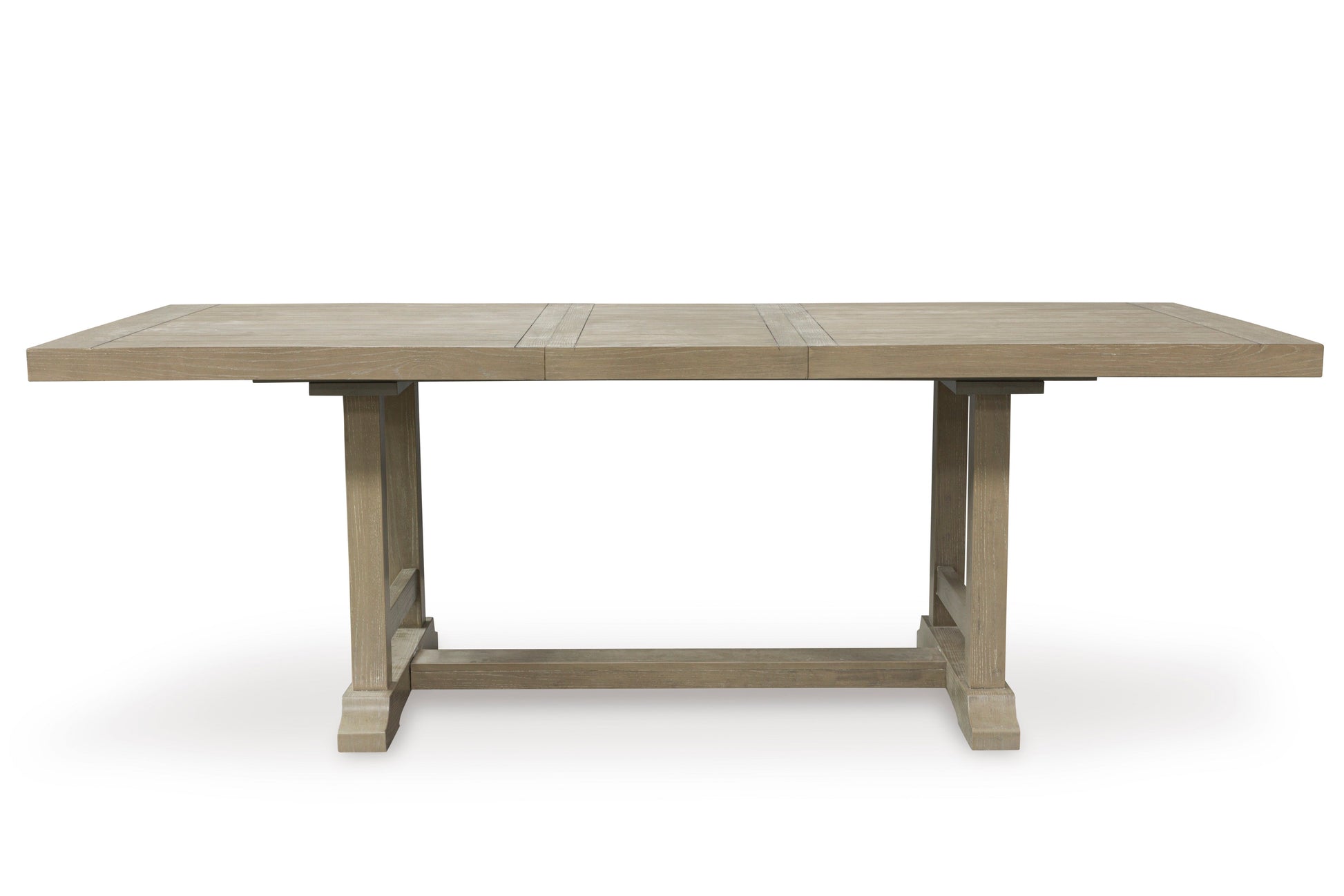 Indulge in relaxed refinement with the Vallardia extension dining table. A casual silhouette and light grayish brown finish exemplify its updated take on traditional styling. And the trestle table’s removable leaf makes room for one and all. Now there’s a show of great taste.