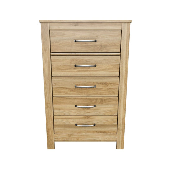 Wood Products and Other, Five Drawer Chest, , Made with engineered wood (MDF/particleboard/plywood) and decorative laminate for the right balance of affordability and durability;Rich honey brown finish over replicated walnut grain with authentic touch;Decorative laminate replicates natural or man-made material surfaces with consistent color, pattern and texture;Brushed nickel-tone hardware with black edging;5 smooth-gliding drawers;Drawer interiors are lined with a faux linen laminate for a clean, finished look;Safety is a top priority, clothing storage units are designed to meet the most current standard for stability, ASTM F 2057;Drawers extend out to accommodate maximum access to drawer interior while maintaining safety;Minor assembly required