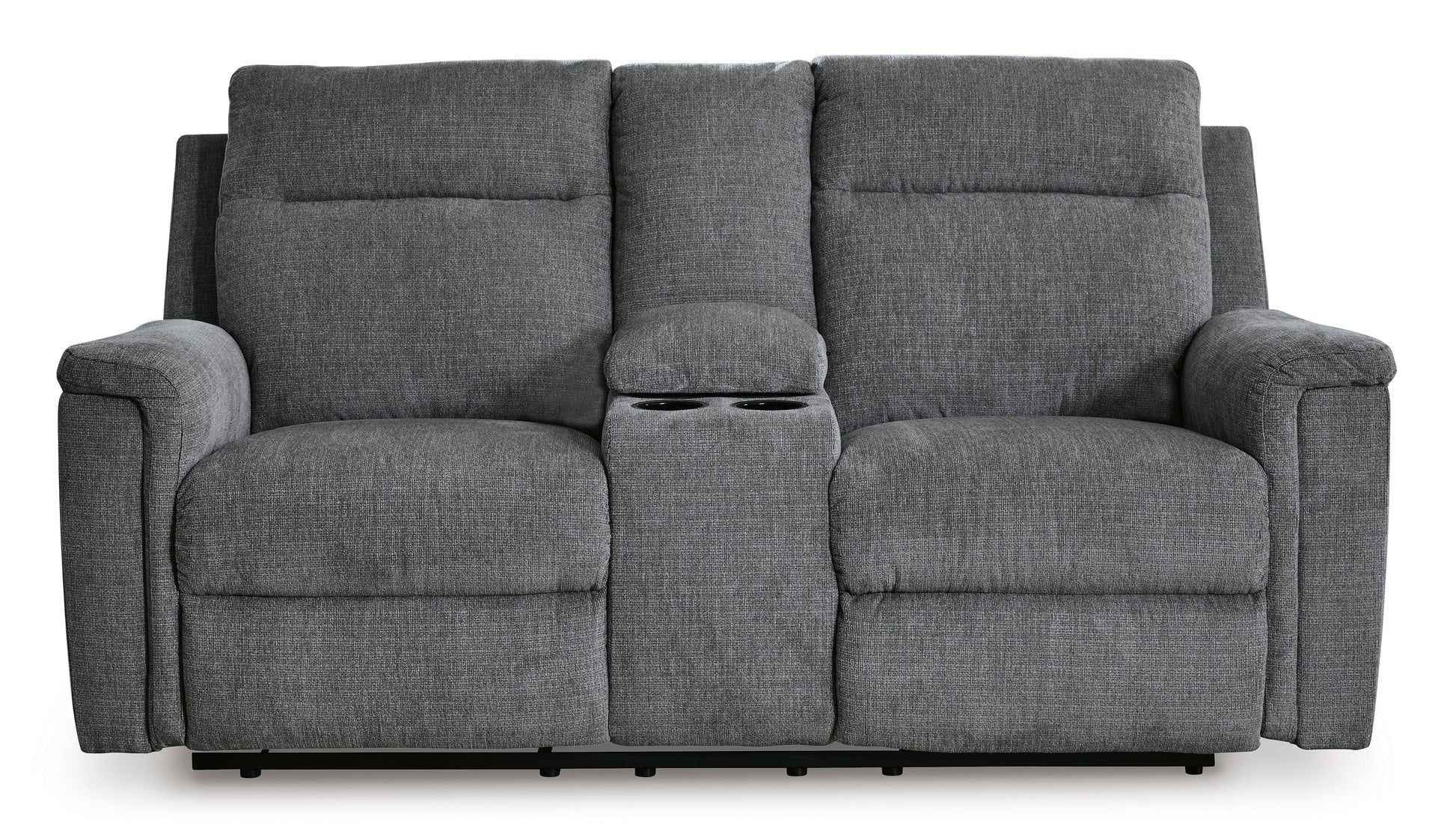 The ability to go from fully upright to relaxed and stretched out, all at the touch of a button, awaits. A beautiful blend of plush upholstery and casual style, the Barnsana power reclining loveseat with console invites you to sink into ultimate comfort. Easily tuck away remotes or gaming controllers and keep drinks close by with its handy console. Whether you're hosting guests or lounging alone, you’ll find it hard to leave your living room—that’s a given.