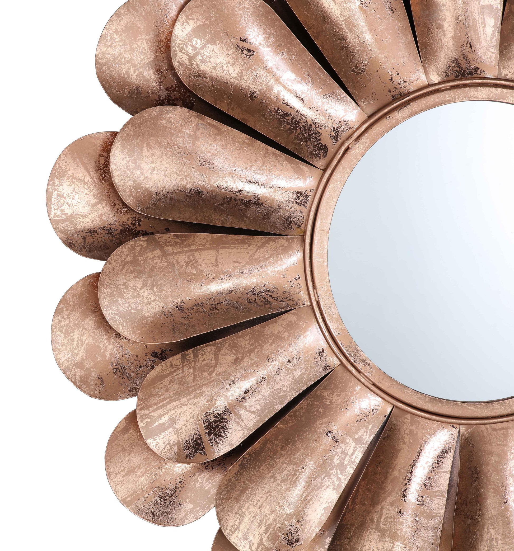 Featuring a distressed rose gold finish and hand hammered frame; reminiscent of a blossoming flower, this mirror will add beauty and texture to any space.
