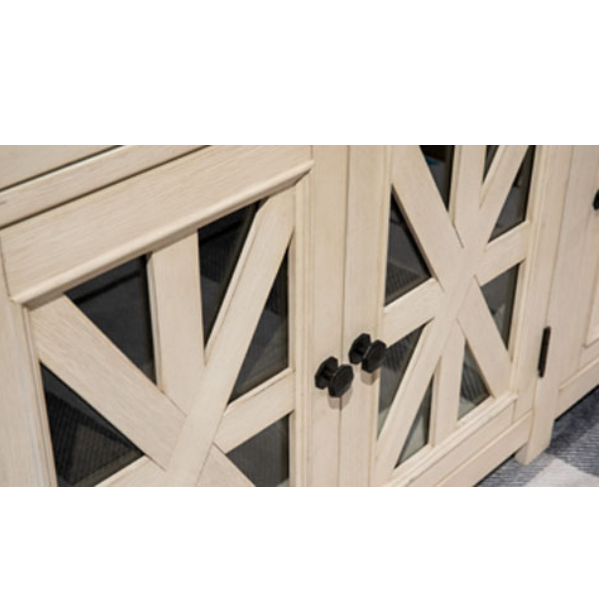 Made with select hardwood solids, acacia and white oak veneers, MDF substrate and metal;Textured antiqued white finish with contrasting weathered gray top;Metal knobs with black iron finish;3 drawers with fully finished interior, dovetail construction and heavy duty ball-bearing side glides;3 storage cabinets; center doors with inset glass;3 adjustable shelves;Framed doors with crossbuck overlays;Cutouts for cord management;Assembly required73" TV StandTV Stand