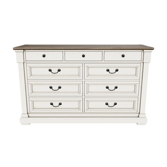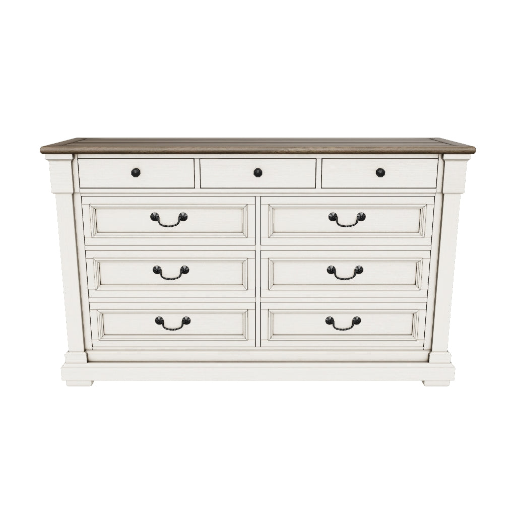 Dresser only;Made of veneers, wood and engineered wood;Two-tone finish (weathered oak top over antique white);Plank-style top;9 smooth-gliding drawers with dovetail construction (top 3 drawers felt lined);Black faceted hardware;Includes tipover restraint device