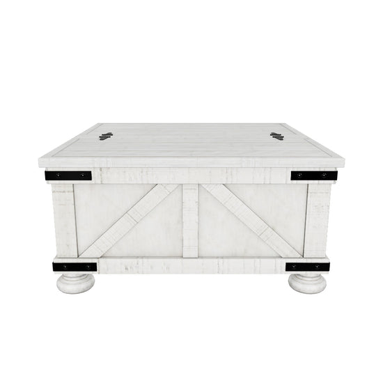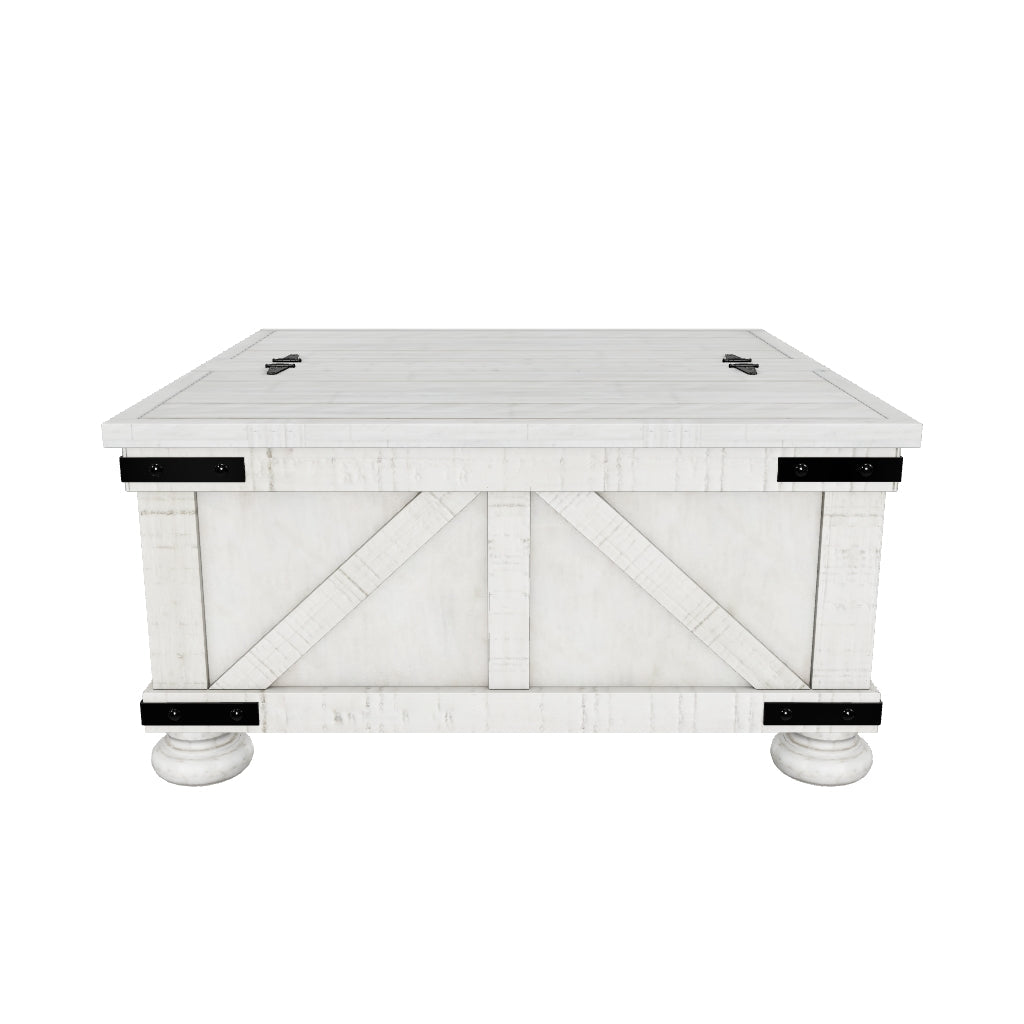 Double up on form and function with the Carynhurst square coffee table with storage. Its dual-lid tabletop provides easy access to the roomy storage space. Crafted with a distressed whitewash finish, crossbuck detailing and metal bracket appliques, this generously scaled coffee table is rustic farmhouse living at its best.