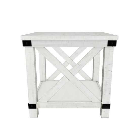 Sporting a distressed whitewash finish, the Carynhurst end table is rustic farmhouse living at its best. Crossbuck styling adds striking flair. Metal industrial brackets incorporate an industrial twist.