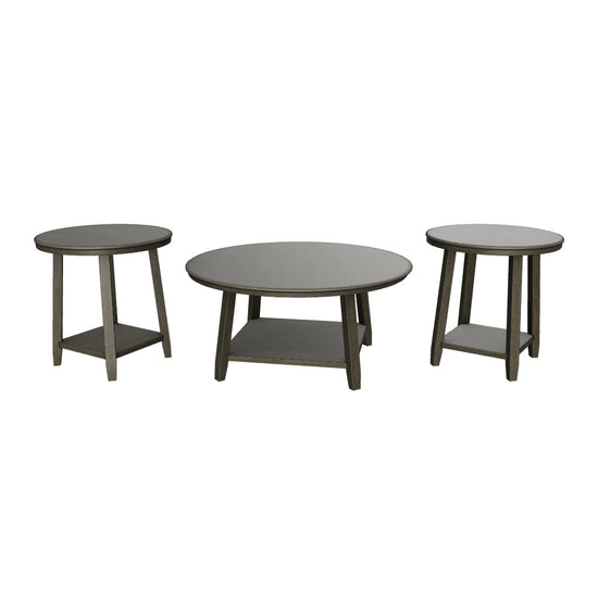 Includes coffee table and 2 end tables;Made of Acacia wood, veneer and engineered wood;Antiqued gray washed finish;Convenient lower shelf for additional storage and display space;Assembly required