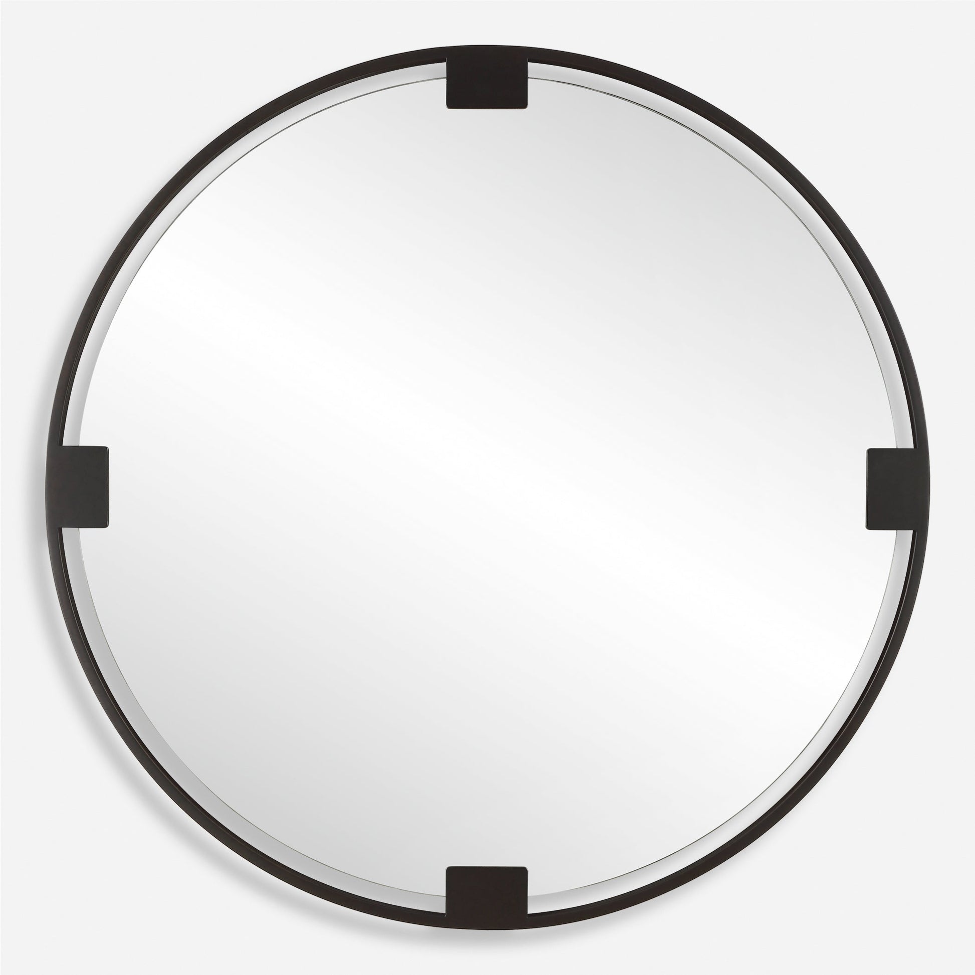 This Round Mirror Is Crafted With A Hefty Dark Bronze Iron Frame, Adorned With Matching Bands That Suspend A Polished Edge Mirror For A Look That Exudes A Timeless Charm That Complements Any Decor Style.