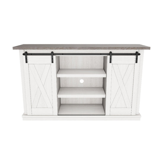 Details & OverviewWith its two-tone finish, crossbuck details and authentic charm, the Dorrinson TV stand is right in tune with your relaxed approach to high style. Beautifully made to accommodate your media equipment, it’s well equipped with adjustable shelving, cutouts for wire management and, of course, a pair of sliding barn doors you can center or place to the side. What a mastery in modern farmhouse living.