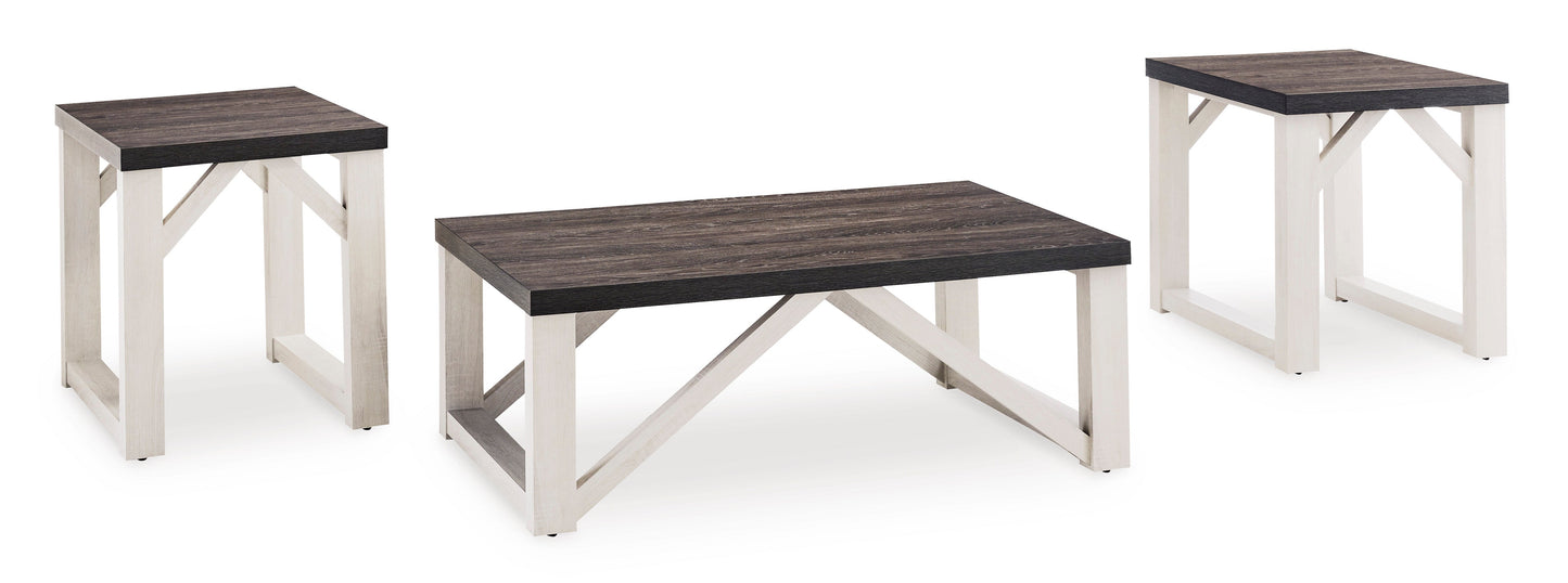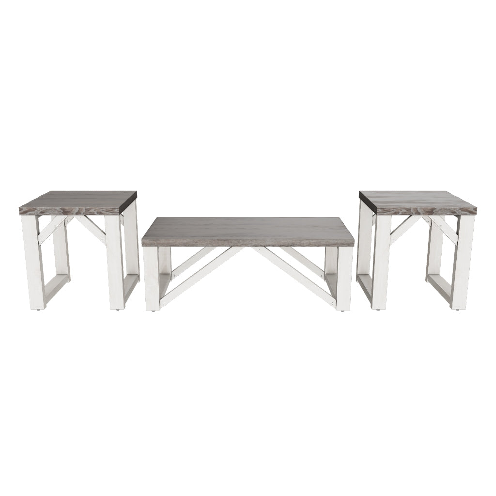 Includes coffee table and 2 end tables;Made of decorative laminate and MDF substrate;Replicated gray wood top;Antiqued white base;Assembly required