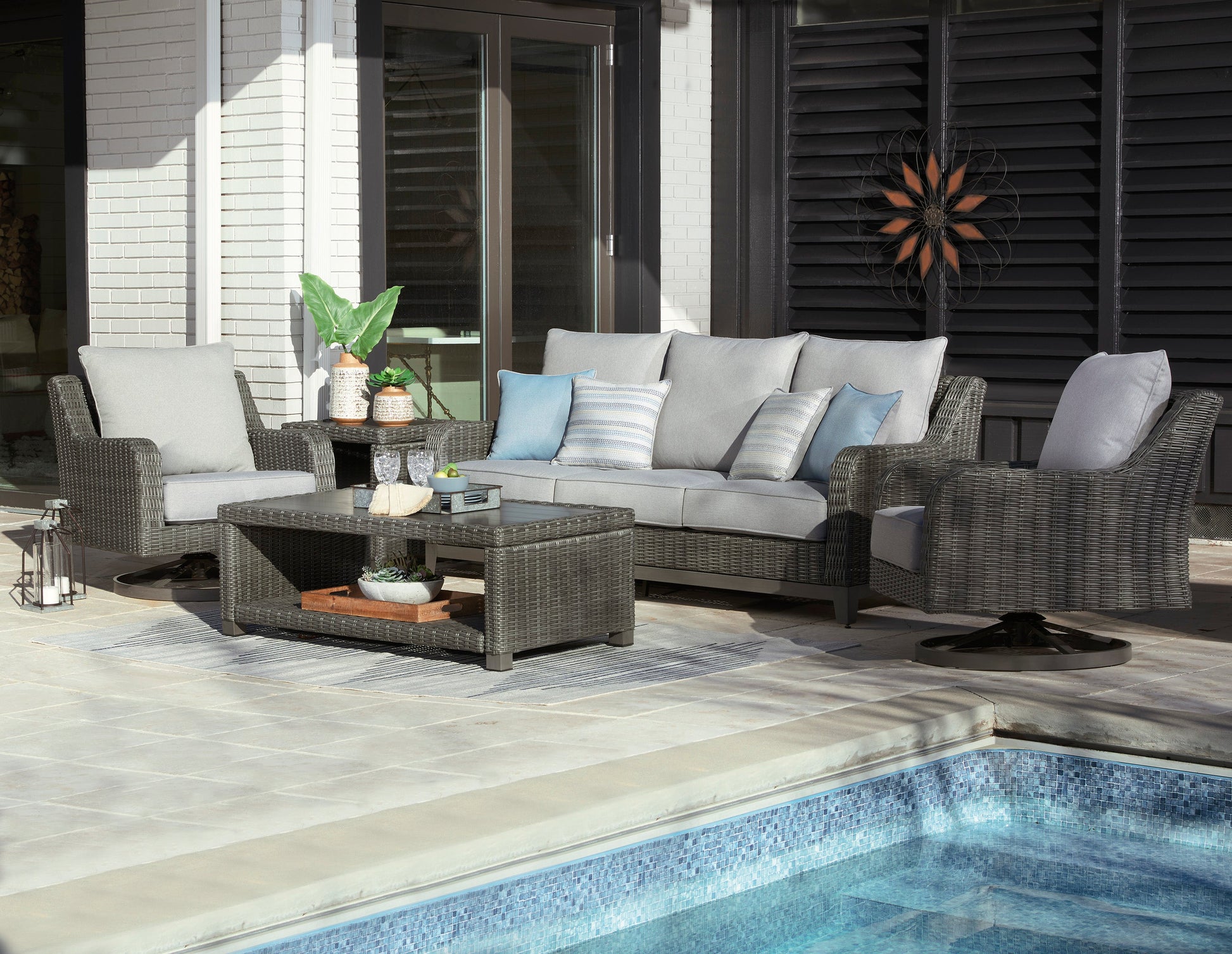 Product number Dimensions Quantity Product name P518-701 Width 49.75 inch(es) / 126.36 cm Height 17.75 inch(es) / 45.08 cm Depth 26.63 inch(es) / 67.64 cm Weight 36 lb(s) / 16.33 kg 1.00 Elite Park Outdoor Coffee Table P518-702 Width 22.13 inch(es) / 56.21 cm Height 22.63 inch(es) / 57.48 cm Depth 22.25 inch(es) / 56.52 cm Weight 24.01 lb(s) / 10.89 kg 2.00 Elite Park Outdoor End Table P518-821 Width 32.25 inch(es) / 81.92 cm Height 33 inch(es) / 83.82 cm Depth 34 inch(es) / 86.36 cm Weight 44 lb(s) / 19.96 kg 1.00 Elite Park Outdoor Swivel Lounge with Cushion P518-835 Width 55.5 inch(es) / 140.97 cm Height 38 inch(es) / 96.52 cm Depth 34.75 inch(es) / 88.26 cm Weight 64 lb(s) / 29.03 kg 1.00 Elite Park Outdoor Loveseat with Cushion P518-838 Width 80 inch(es) / 203.2 cm Height 37.75 inch(es) / 95.88 cm Depth 36.5 inch(es) / 92.71 cm Weight 84 lb(s) / 38.1 kg 1.00 Elite Park Outdoor Sofa with Cushion