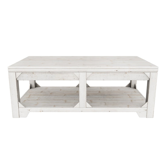 Take in the country fresh look of the Fregine lift top coffee table and reminisce of a simpler time. Its farmhouse style is evident in its stocky design with planked top/bottom shelf, unique triangle accents and relaxed white washed finish. With a handcrafted look thanks to reclaimed wood, you'll love the casual feel this piece brings to your living area. Plus, easy lift top feature accommodates eating or working in front of the television.