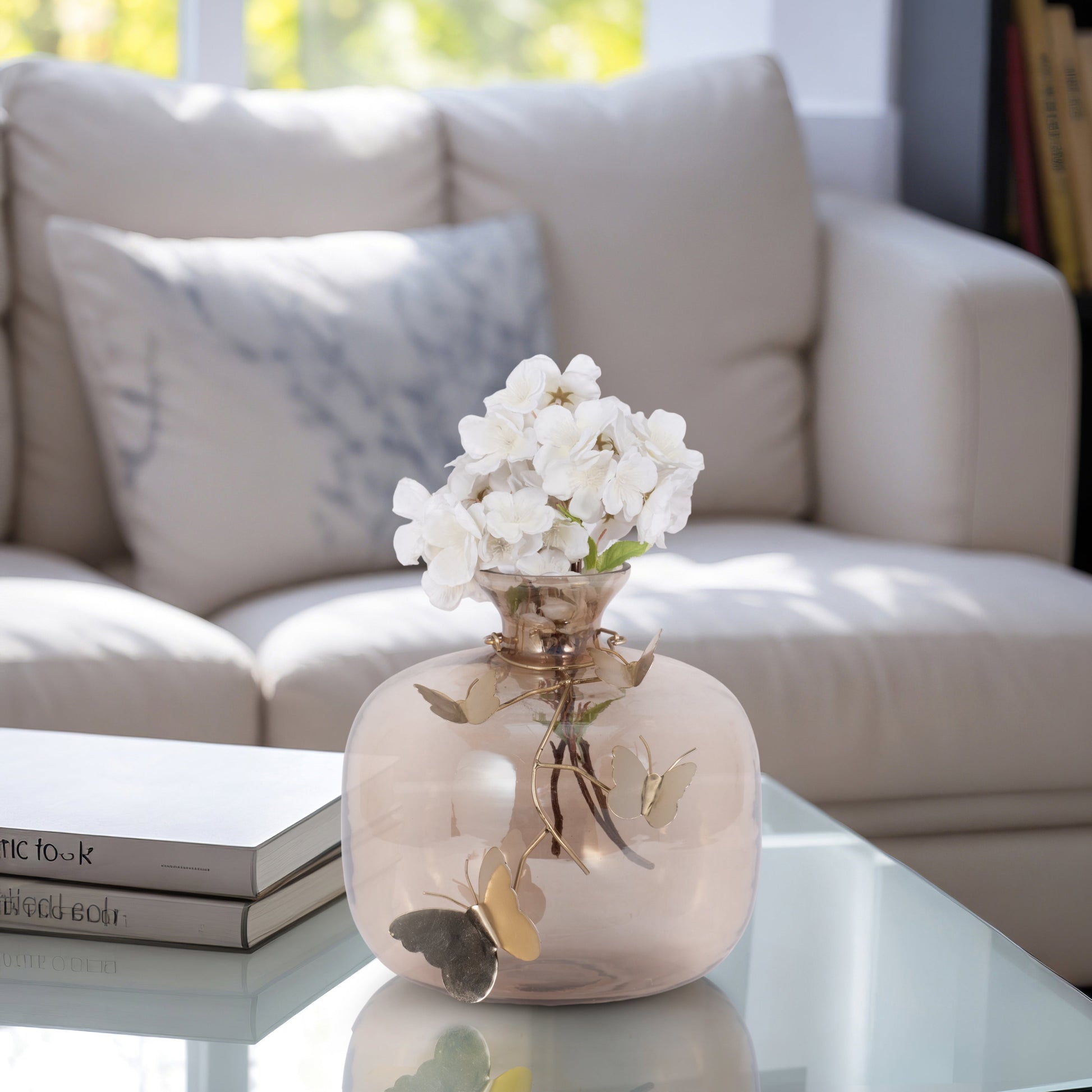 GLASS, 10" VASE W/ BUTTERFLY GARLAND, GOLD