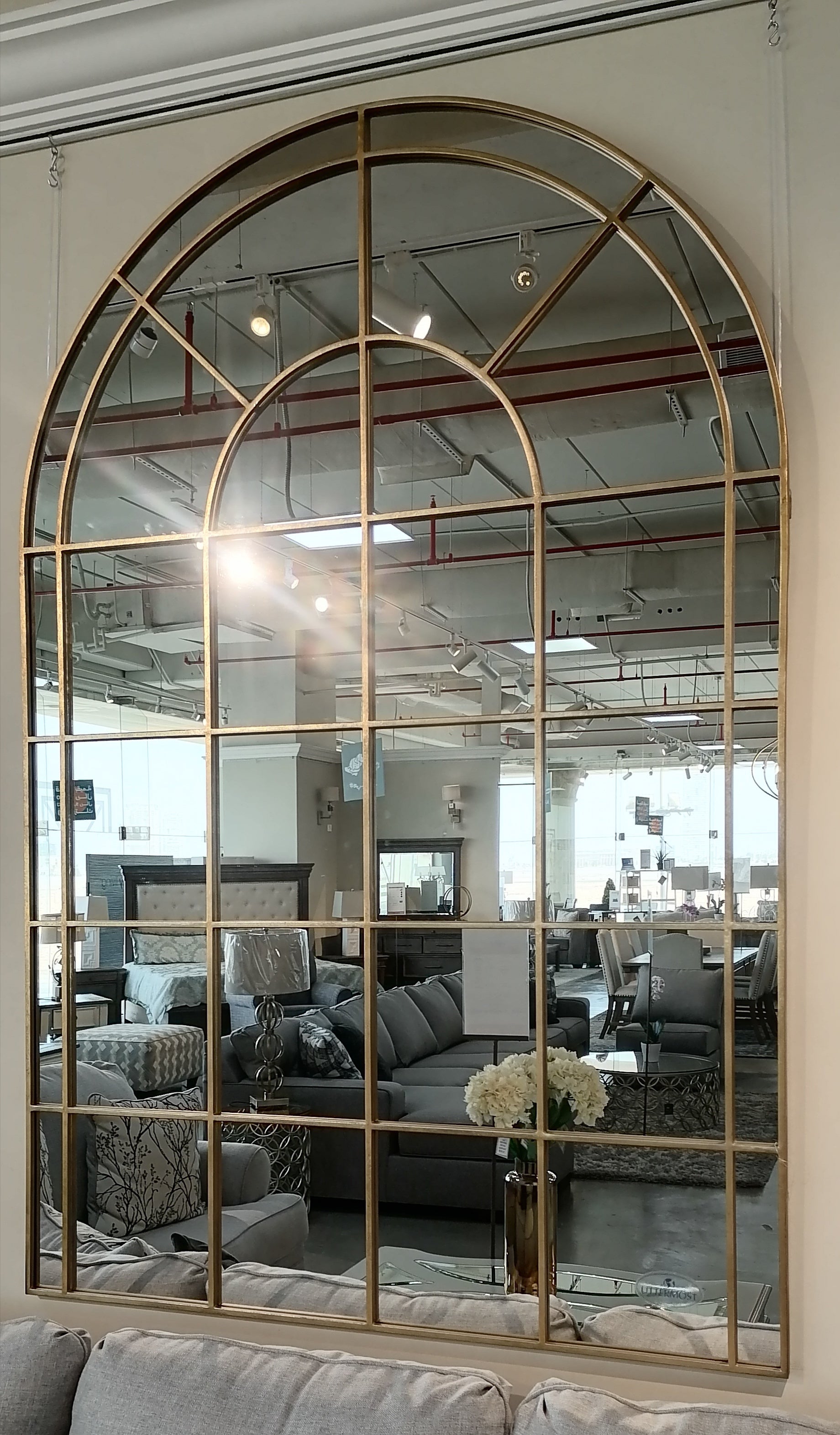 المرآة القوسية هذه هي تحفة تصميم تجمع بين الكلاسيكية والانتقالية، حيث تتميز بإطار من الحديد الرقيق مطلي بطبقة ذهبية