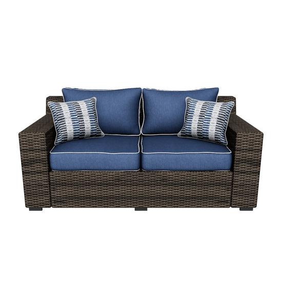 أريكة خارجية مع وسادة؛ خوص راتنجي مقاوم لجميع الأحوال الجوية منسوج يدويًا على إطار من الألومنيوم المتين؛ الألومنيوم المطلي بالمسحوق يقاوم الصدأ والبهتان؛ وسادة بسحاب مغطاة بقماش Nuvella® عالي الأداء؛ قلب وسادة من الإسفنج المقاوم لجميع الأحوال الجوية ملفوف بالبوليستر الناعم؛ قماش وحشو مستوردان؛ نظف القماش بصابون خفيف وماء، واتركه يجف في الهواء؛ بالنسبة للبقع العنيدة، استخدم محلولًا من كوب واحد من المبيض إلى جالون واحد من الماء؛ التجميع مطلوب