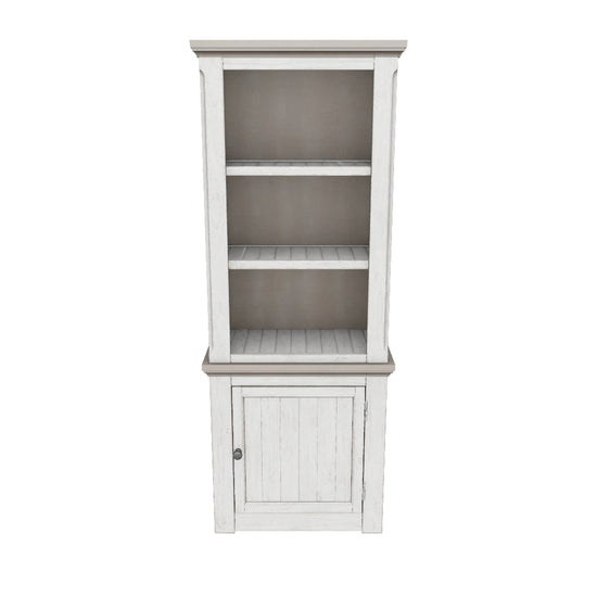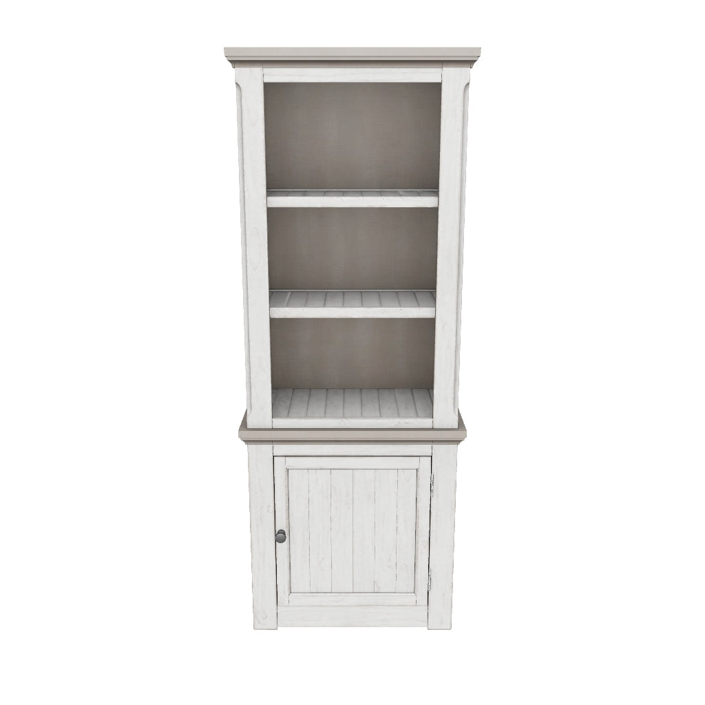 Made with pine wood, pine veneer and engineered wood;Two-tone finish; distressed weathered gray top with distressed vintage white base;Round metal knob with aged iron-tone finish;3 open shelves;Cabinet with 1 shelf;Assembly required