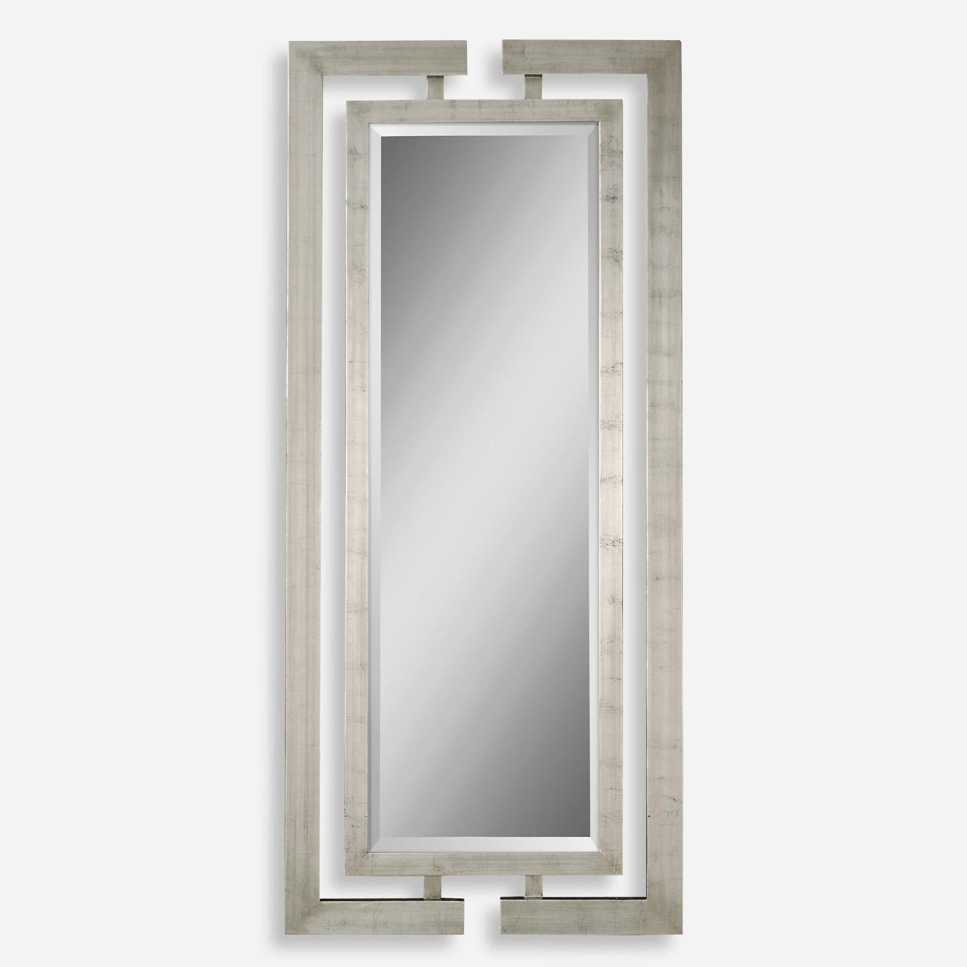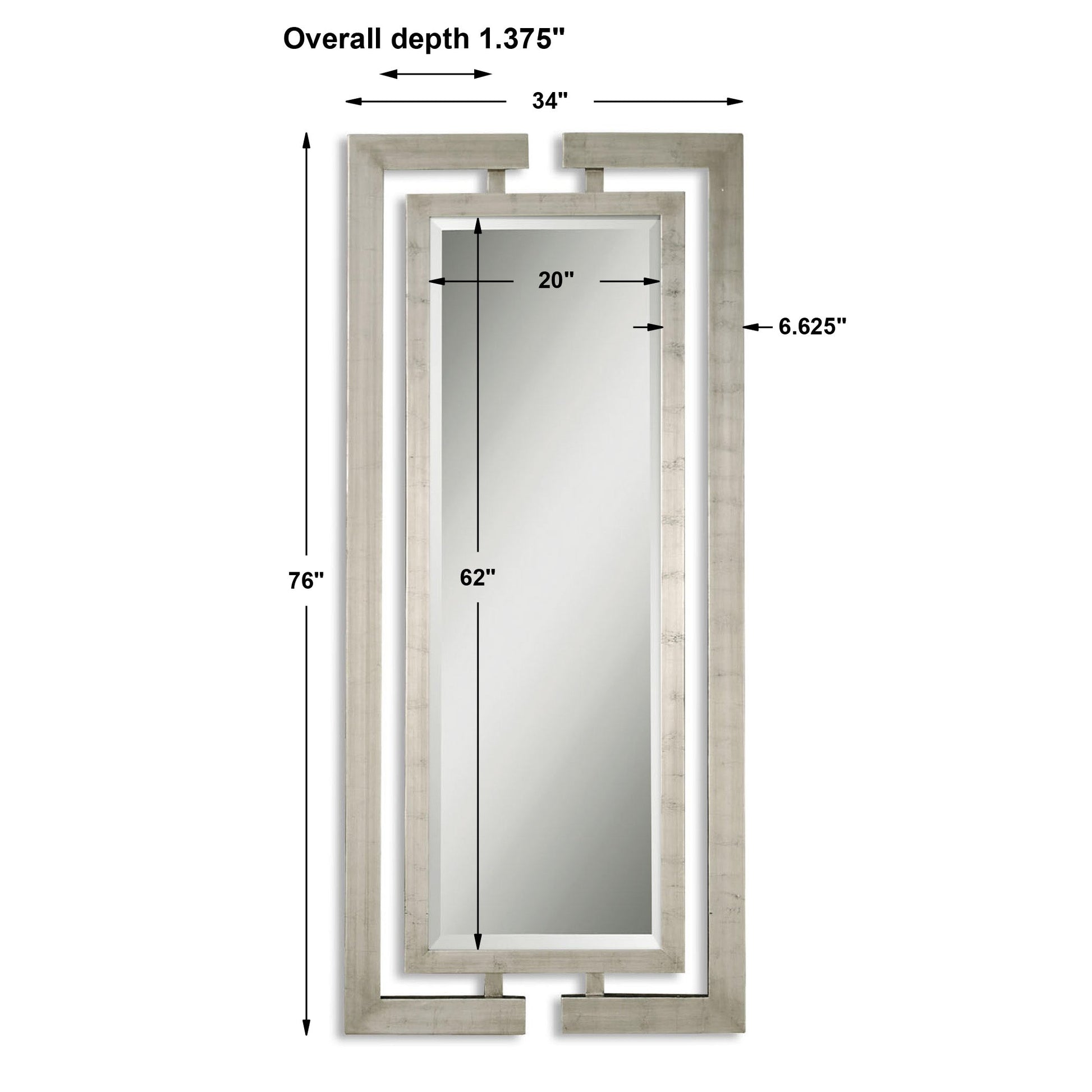 • This Stately Mirror Features Dual Wooden Frames Attached At The Top And Bottom With A Scratched Silver Leaf Finish. Frames Have Open Detail For Wall Color To Show Through. Mirror Has A Generous 1 1/4" Bevel. May Be Hung Horizontal Or Vertical.