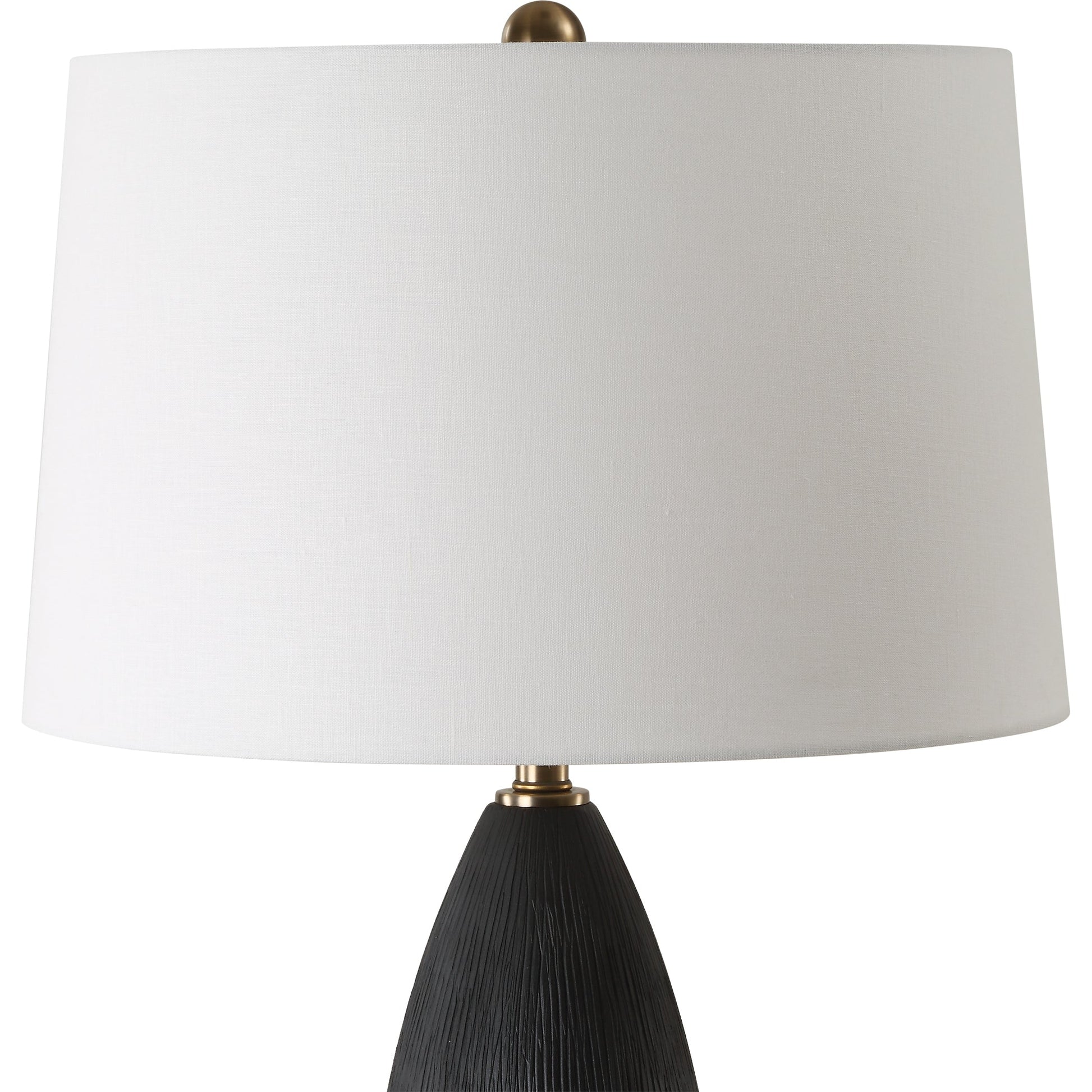 The Jett Table Lamp Showcases A Matte Black Ceramic Base With Organic Texturing, Accented With Plated Antique Brass Details.