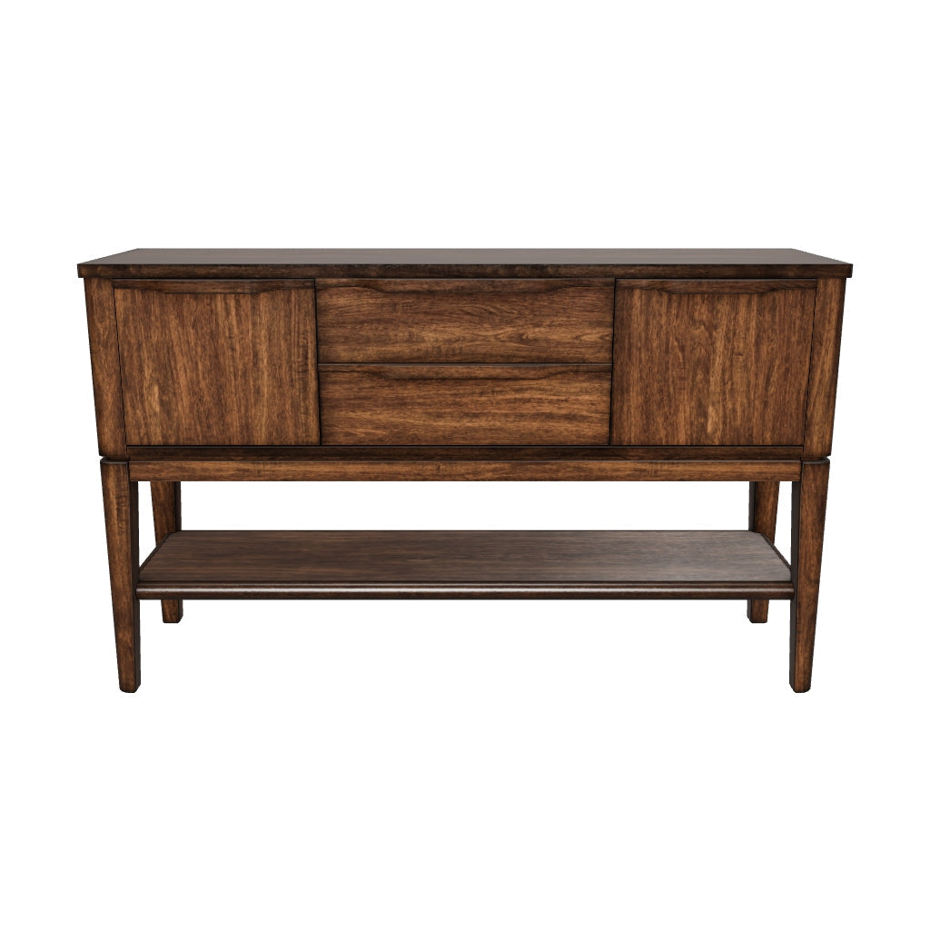 This dining sever exemplifies casual contemporary design with an urban vibe. Warm and inviting with a rich brown finish, it makes storing dining essentials that much sleeker thanks to its two smooth-gliding drawers and spacious cabinets. Seamlessly incorporated wood handles subtly nod to mid-century modern design. What a stunning reflection of your simple-meets-elegant sensibility.