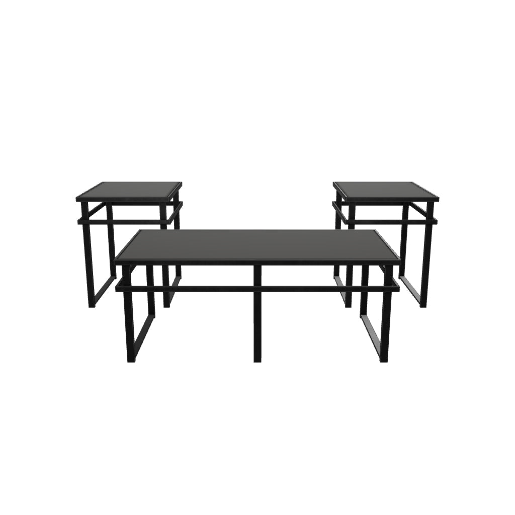 This coffee table set turns the tables on a monochromic look with opaque black glass tabletops complemented by sleek metal framing. A standout style reserved for ultra-modern tastes.