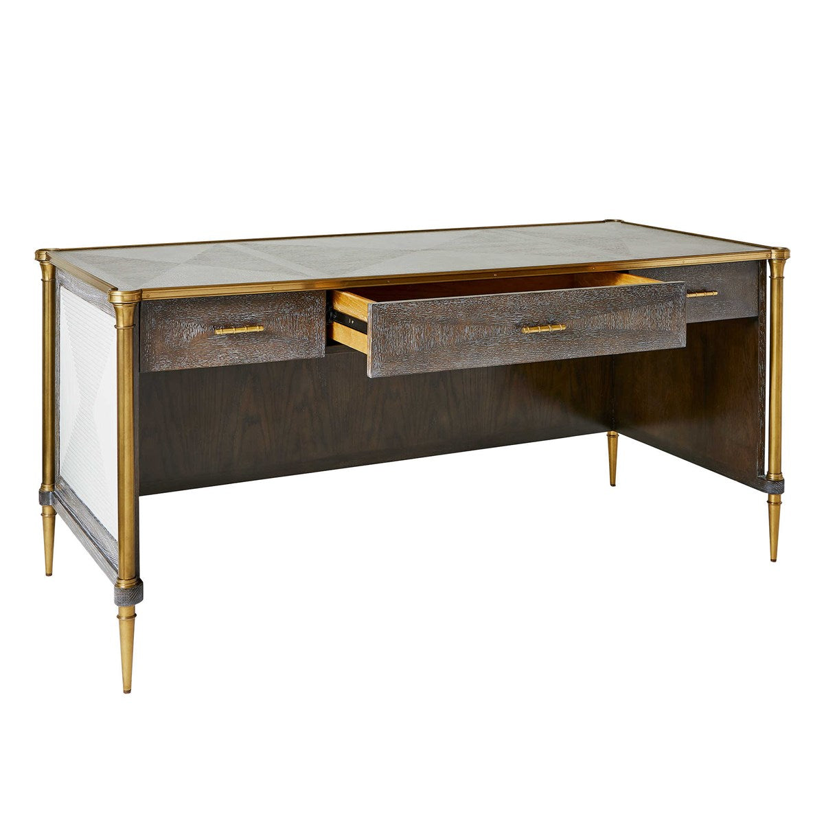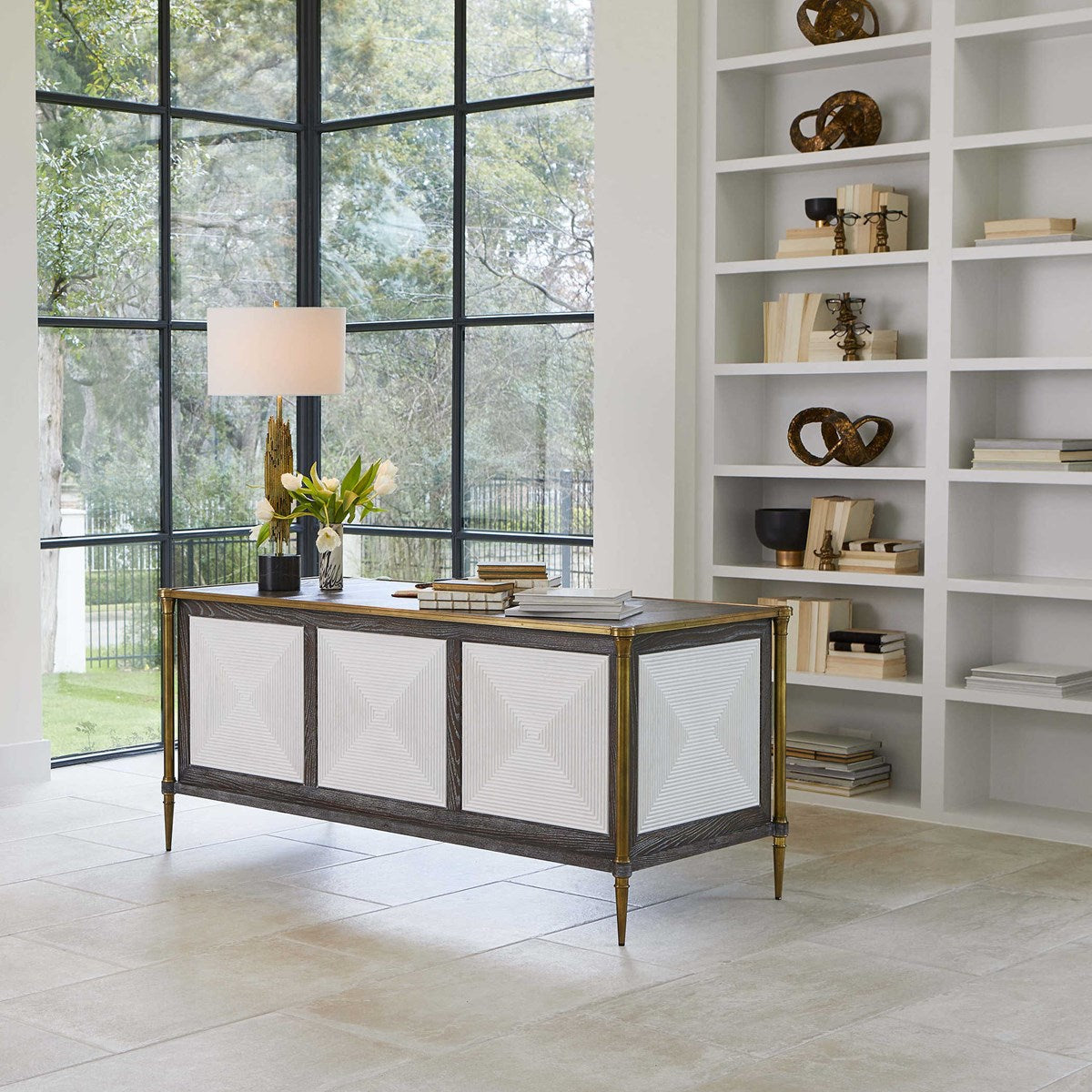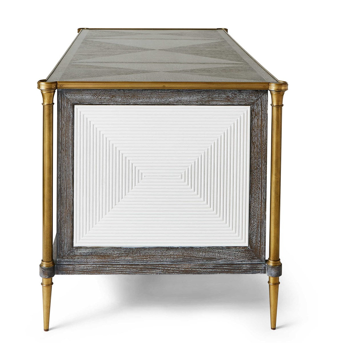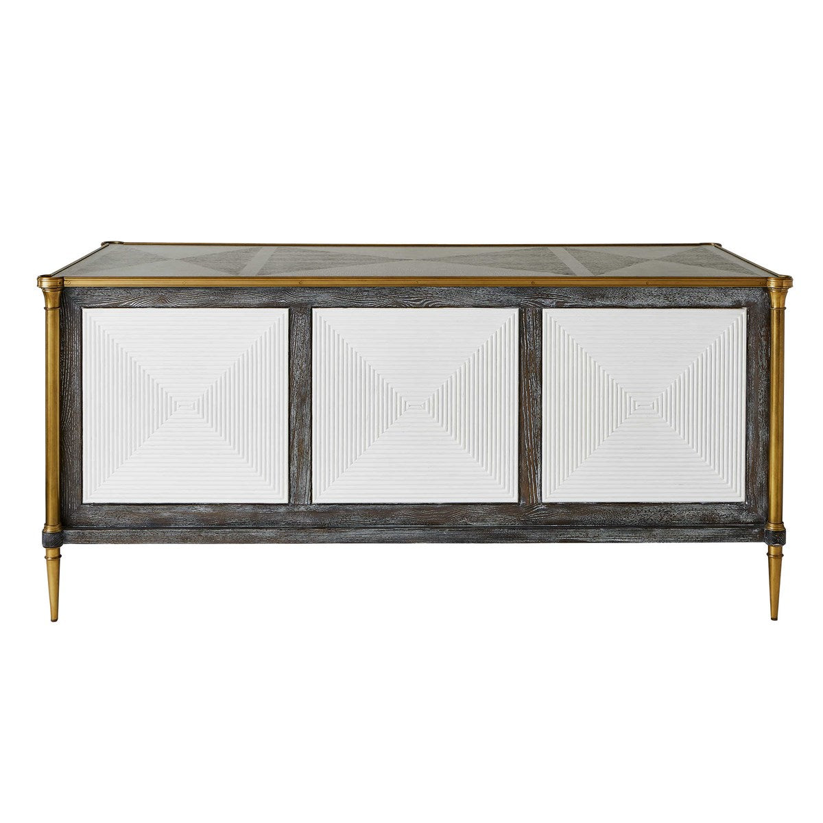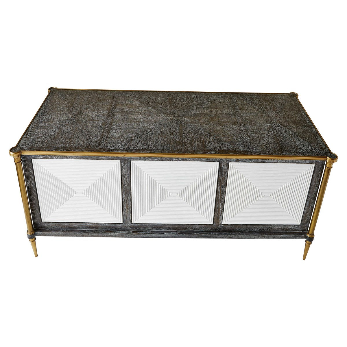 Expertly hand pieced from natural teak, washed in a pale gray glaze, atop iron block feet in burnished nickel. Due to the hand crafted nature, each piece will vary. Cracks and variations in grain are also normal.