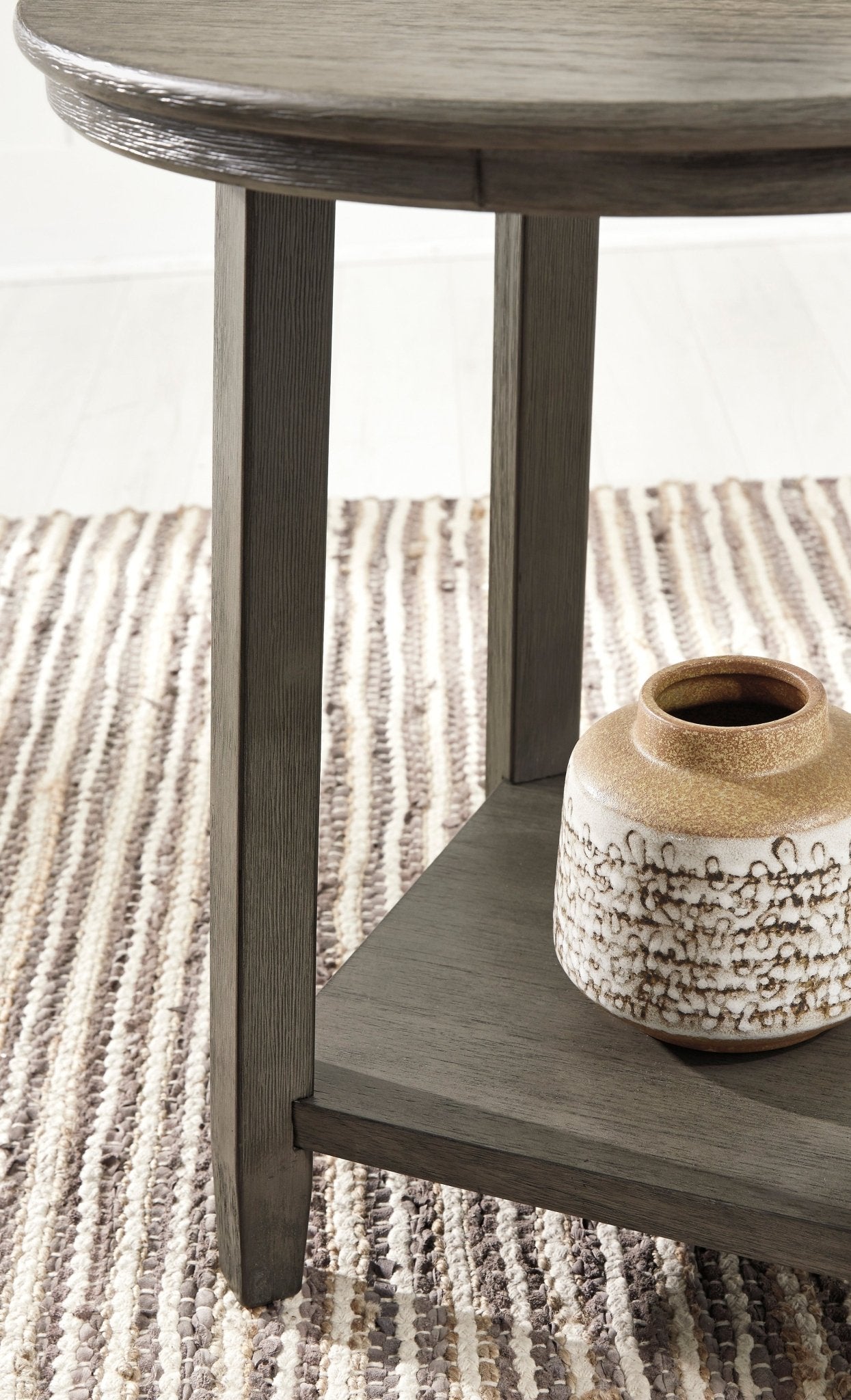 Round out your seating area with the Caitbrook coffee table set in a contemporary two-tiered round design. Clean-lined design is simple, yet striking—while its antiqued gray washed finish over Acacia wood and veneer is anything but ordinary.Item Weight: 36.29Kg