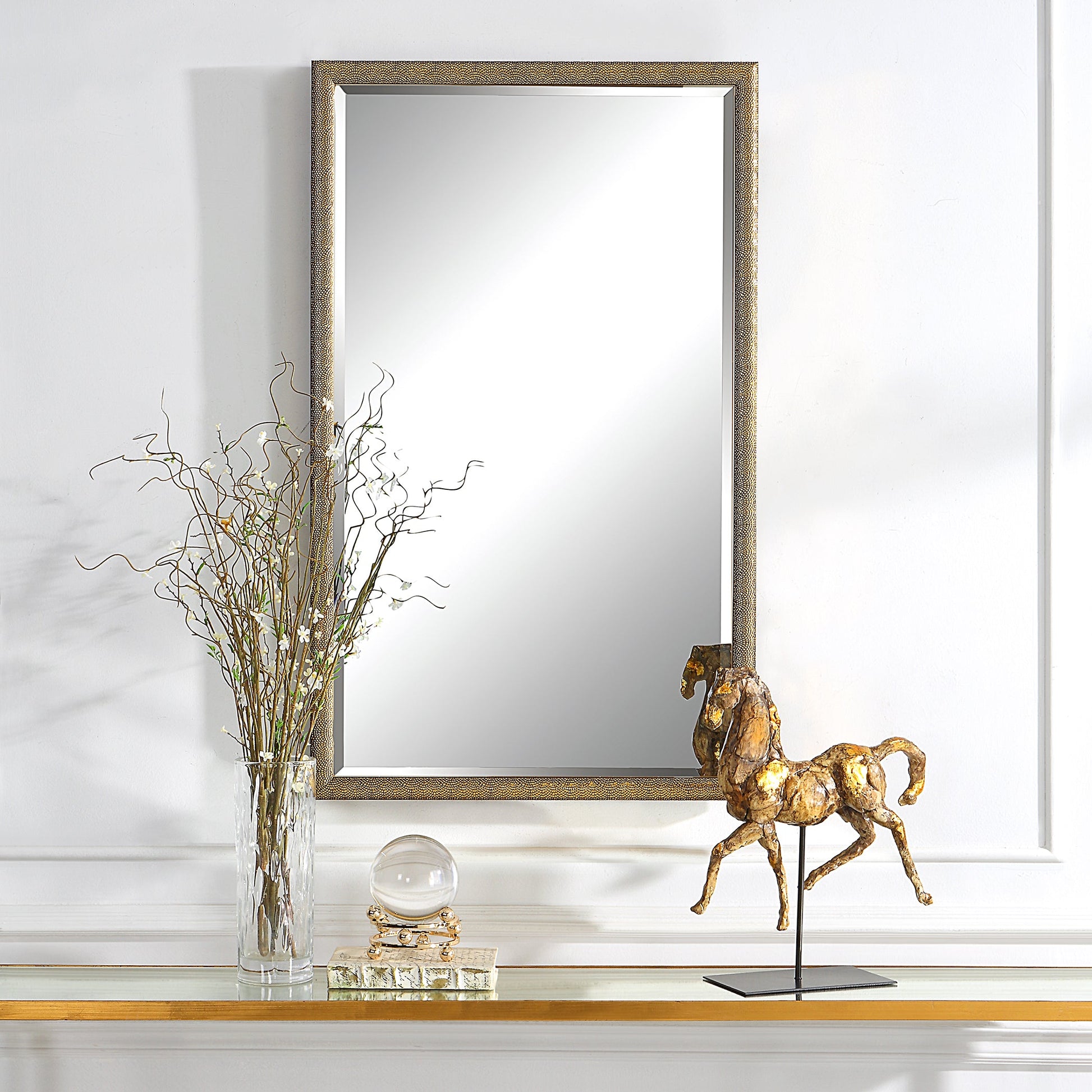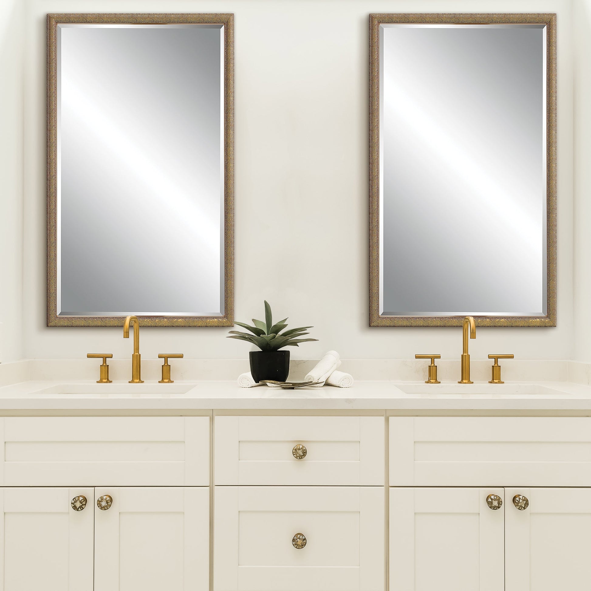 • The heavily textured profile of this frame is enhanced by a gold finish against a dark brown background. The mirror has a 1" bevel and may be hung either vertically or horizontally.