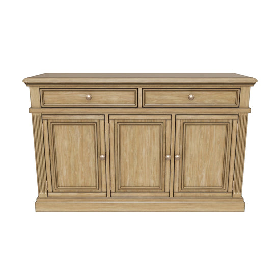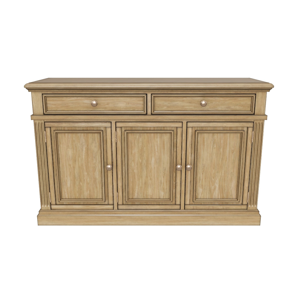 منتجات خشبية وغيرها، خزانة جانبية لغرفة الطعام، مصنوعة من خشب صلب، وقشرة خشب البتولا، وقاعدة من خشب MDF؛ طلاء بني فاتح لامع؛ مقابض ذهبية فاتحة اللون؛ درجان بتشطيب داخلي كامل، وبطانة من اللباد، وبنية متداخلة، وآليات انزلاق جانبية بمحامل كروية؛ خزانة بباب واحد وخزانة ببابين؛ يتطلب التجميع