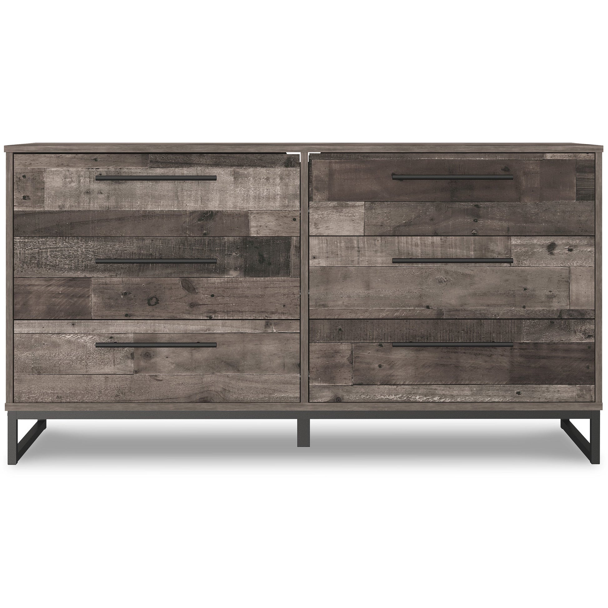 Streamlined design and a stunning finish come together in one simply extraordinary piece. The Neilsville dresser is sure to impress with six smooth-operating drawers, canted metal legs and a rustic butcher block finish over replicated pine grain texture. Its mid-century style is a nod to the past, while the updated finish keeps it solidly in the present.