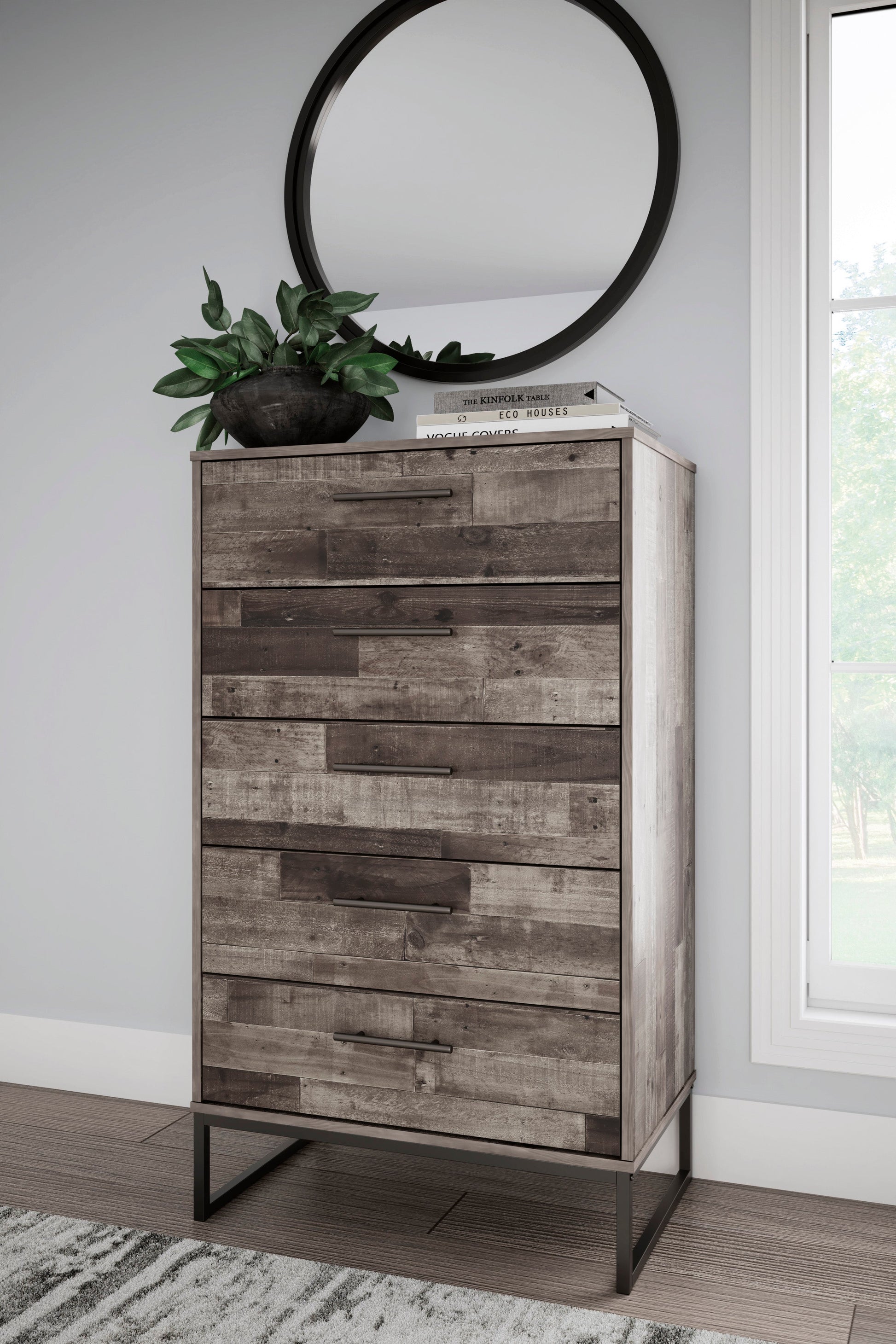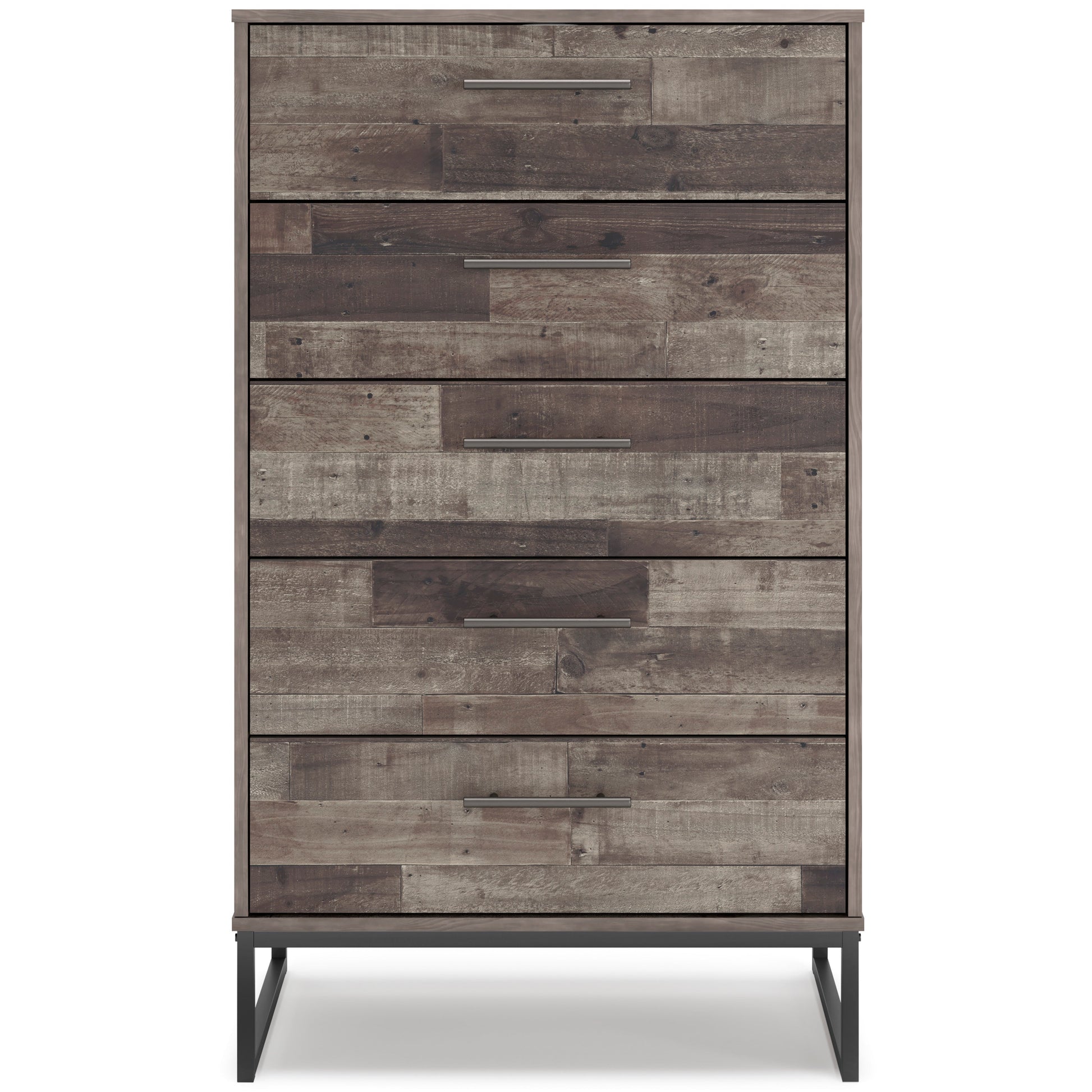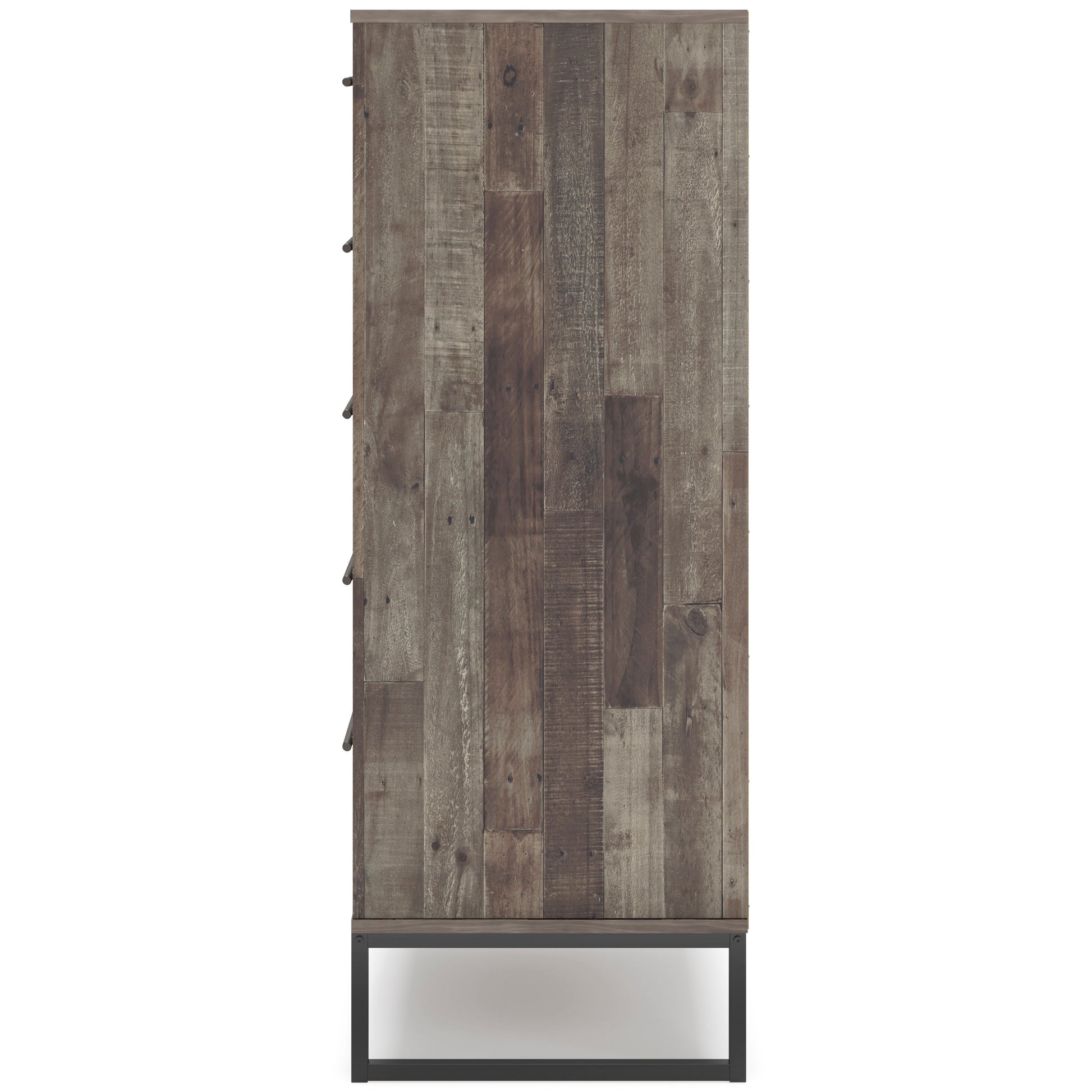 Streamlined design and a stunning finish come together in one simply extraordinary piece. The Neilsville chest of drawers is sure to impress with four smooth-operating drawers, canted metal legs and a rustic butcher block finish over replicated pine grain texture. Its mid-century style is a nod to the past, while the updated finish keeps it solidly in the present.