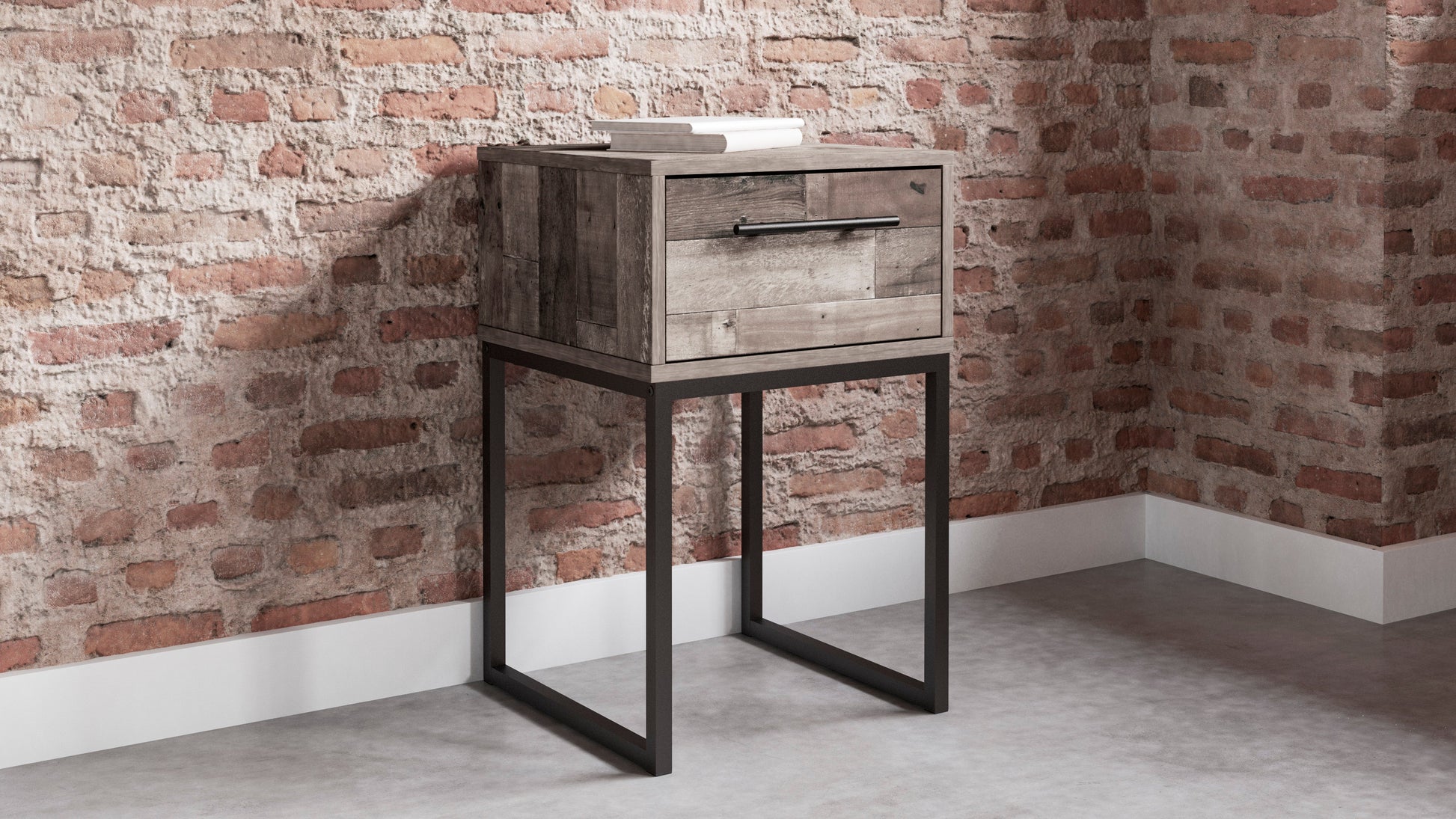 Streamlined design and a stunning finish come together in one simply extraordinary piece. The Neilsville single drawer nightstand is sure to impress with canted metal legs and a rustic butcher block finish over replicated pine grain texture. Its mid-century profile is a nod to the past, while the updated finish keeps it solidly in the present.
