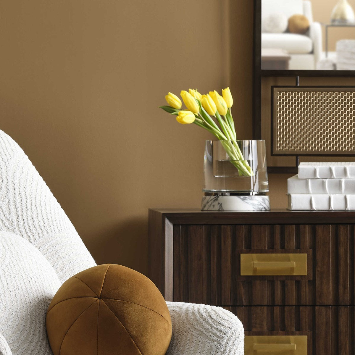 With clean sculptural appeal, this candleholder is formed of optical crystal. It's a natural at capturing and refracting light. A nickel-finished steel gallery tops the heavy base of Arabescato marble. Scaled for cocktail tables or consoles, this modern hurricane can double as a vase or simple object. Candle not included.
