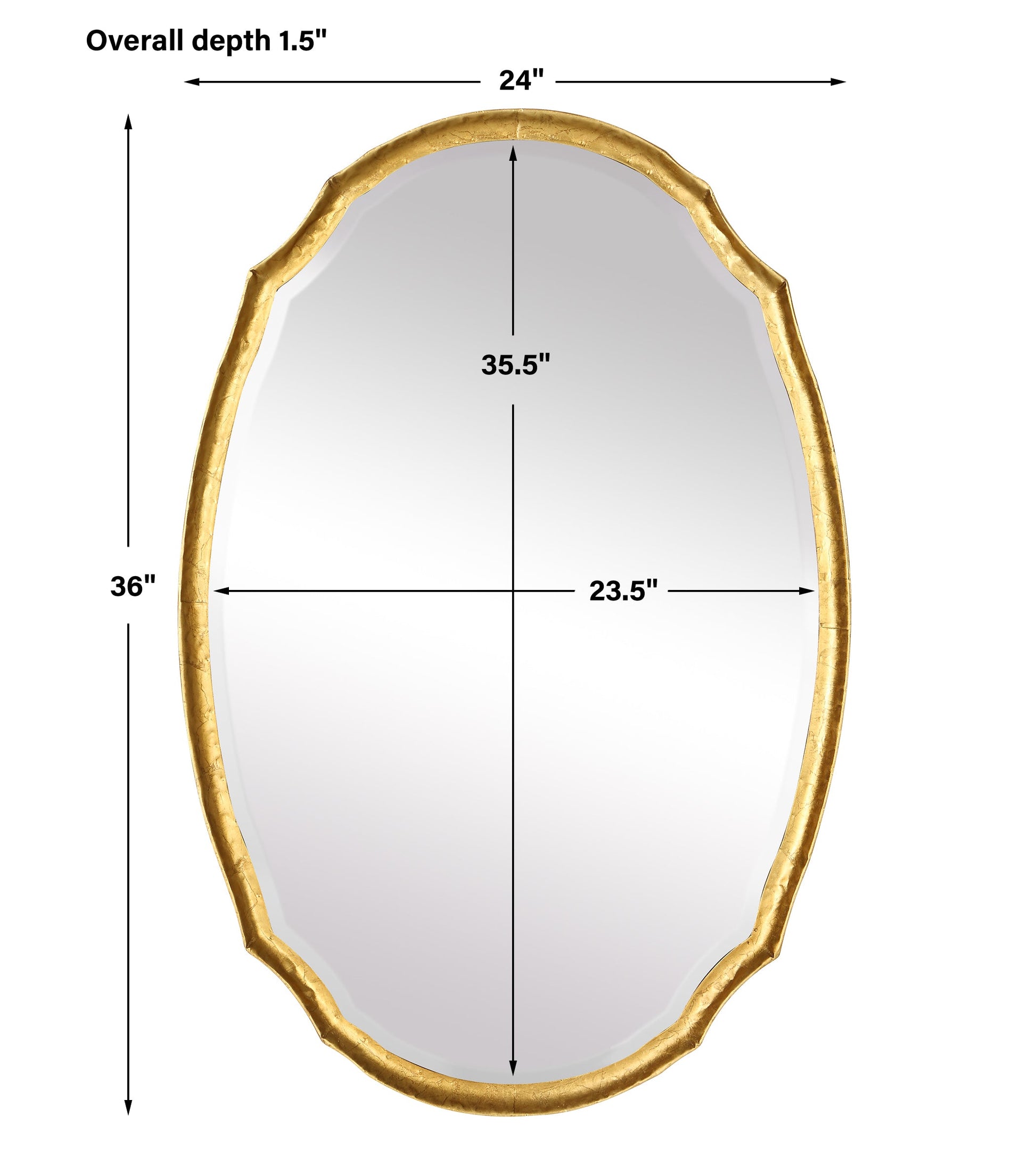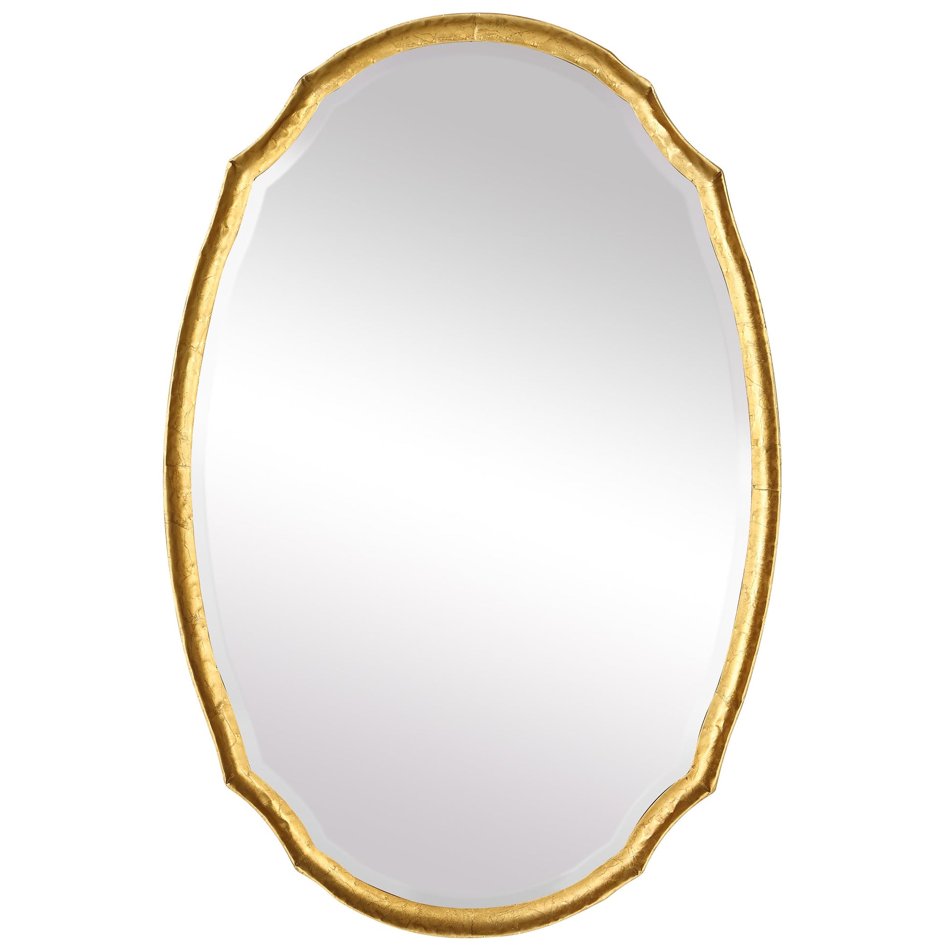 Details & OverviewThis oval shaped frame is made of hammered metal and features a concave surface. It is finished in a lightly antiqued gold leaf. The mirror has a generous 1.25" bevel. May be hung either vertically or horizontally. Also available in silver, W00447, and ch
