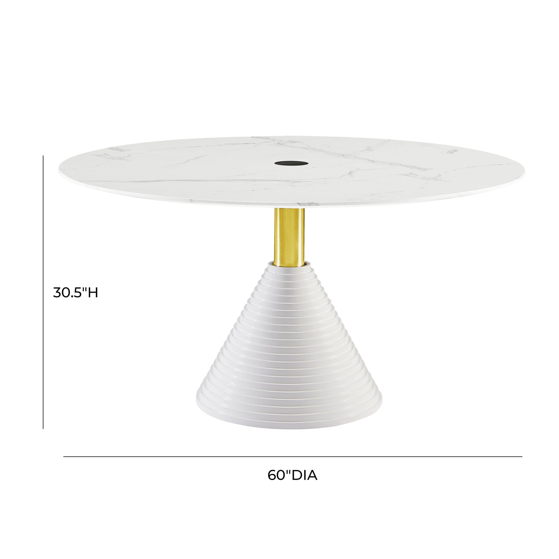 Mid-century Sarrinen style gets a fab makeover with the Piper White Round Dining Table. We're crazy about the ribbed graduated detailing at the base, the pop of polished brass stainless steel, and the marble veneer top. At 60" in diameter, this statement table is the perfect addition to any dining space!