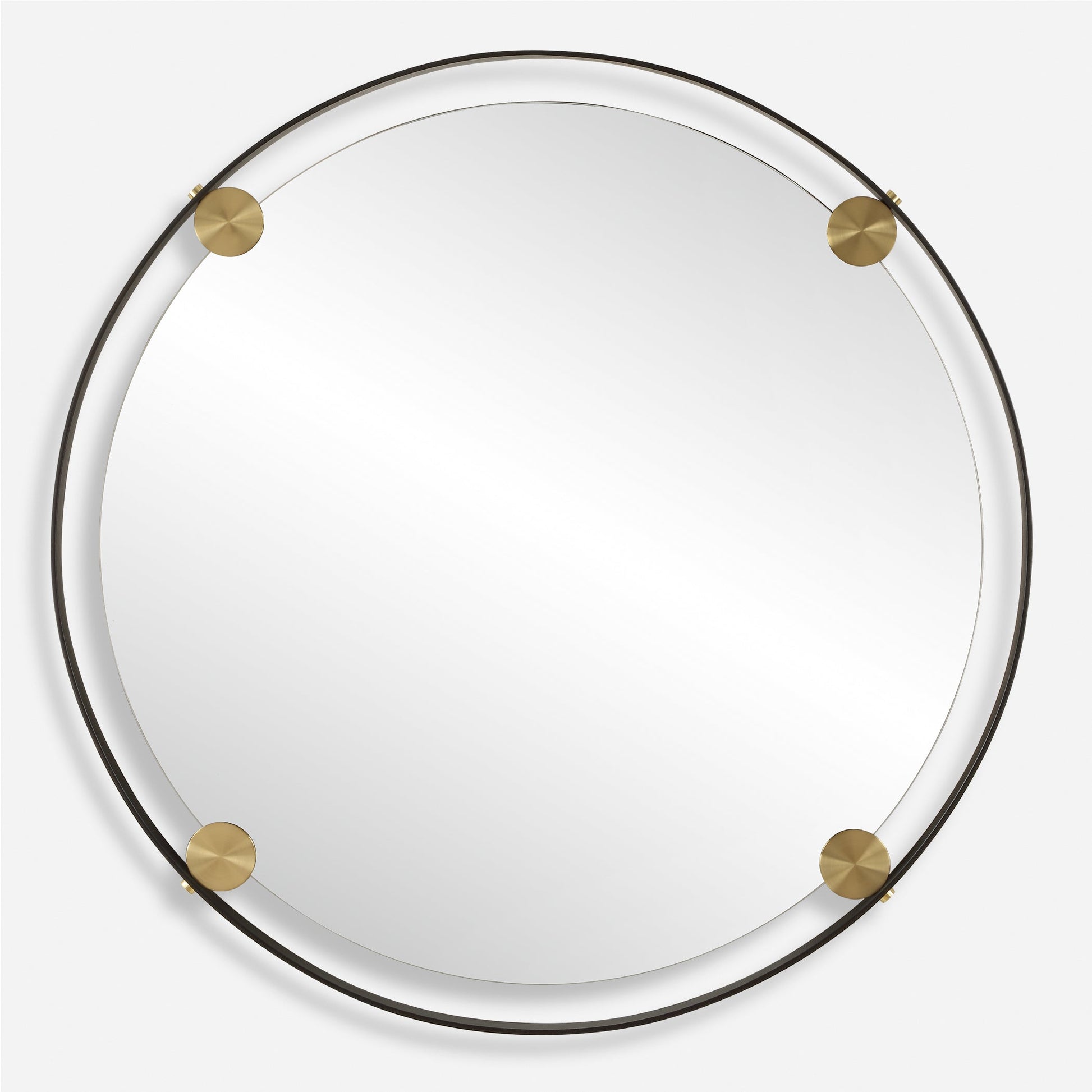 • This Round Mirror Features A Hefty Dark Bronze Iron Frame That Exudes Contemporary Charm, While Plated Brass Medallions Add A Touch Of Traditional Elegance. Suspended Within This Exquisite Frame Is A Polished Edge Mirror, Reflecting A Blend Of Sophistication And Functionality.