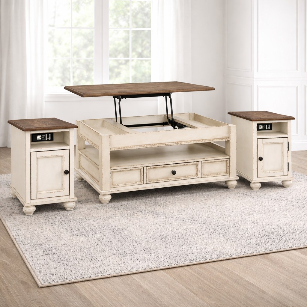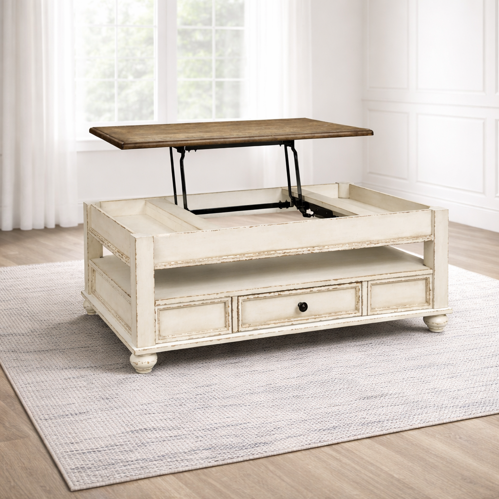 طقم طاولة Realyn ذو السطح القابل للرفع يُمثل نقلة نوعية في تصميم المنازل الريفية التقليدية. يتميز بتشطيب عتيق ثنائي اللون يجمع بين اللون الأبيض المتقشر وسطح خشبي ذي مظهر عتيق، ليُضفي عليه سحراً مضاعفاً. تجمع طاولة القهوة هذه، المزودة بدرج ورف مفتوح، بين العملية والجمال الاستثنائي.
