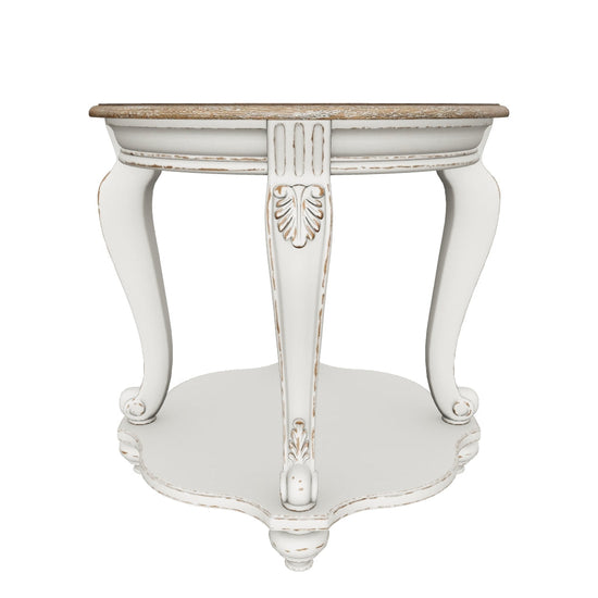 Elevating the art of traditional cottage styling, the Realyn round end table is sure to serve you beautifully for years to come. Antiqued two-tone aesthetic blends a chipped white with a distressed wood finished top for added charm. Classic cabriole legs and shapely lower shelf are a lovely twist. Decorative corbels add refinement.