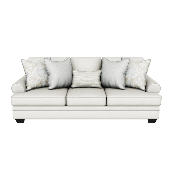 Generously scaled and richly versatile, the Rilynn sofa exemplifies the best in timeless classic style. It's splendidly tailored with transitional roll arms, for a look that's traditional yet far from stuffy. Light, fresh and loaded with multi-textural interest, the sofa's soft chenille upholstery is pure pleasure for the senses. Accent pillows with soothing, neutral tones are a natural fit.