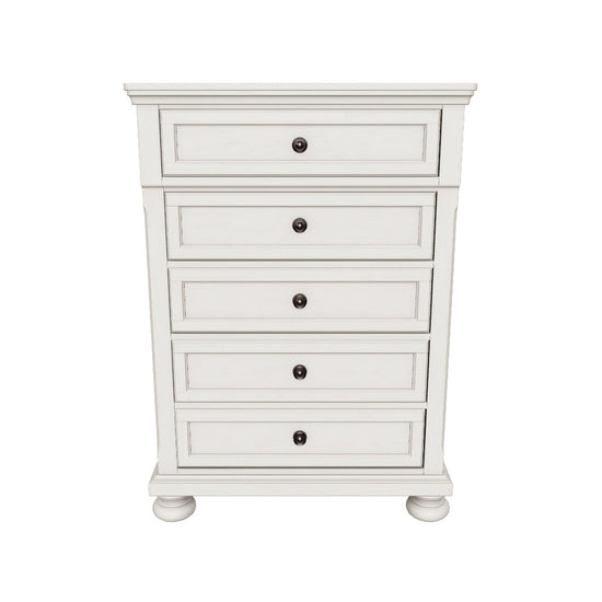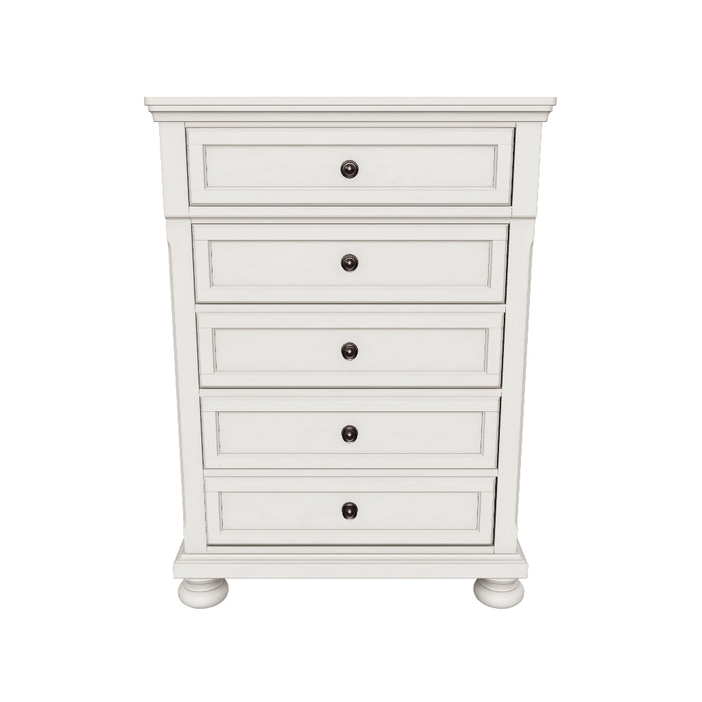 Elegant, timeless furnishings take your bedroom to the next level. Nothing does that better than the Robbinsdale chest of drawers. The antiqued white finish with a wonderful grain texture radiates sophistication, while dark bronze-tone knobs add an ornate touch. Felt finishing in the upper drawers rounds out this tasteful piece.