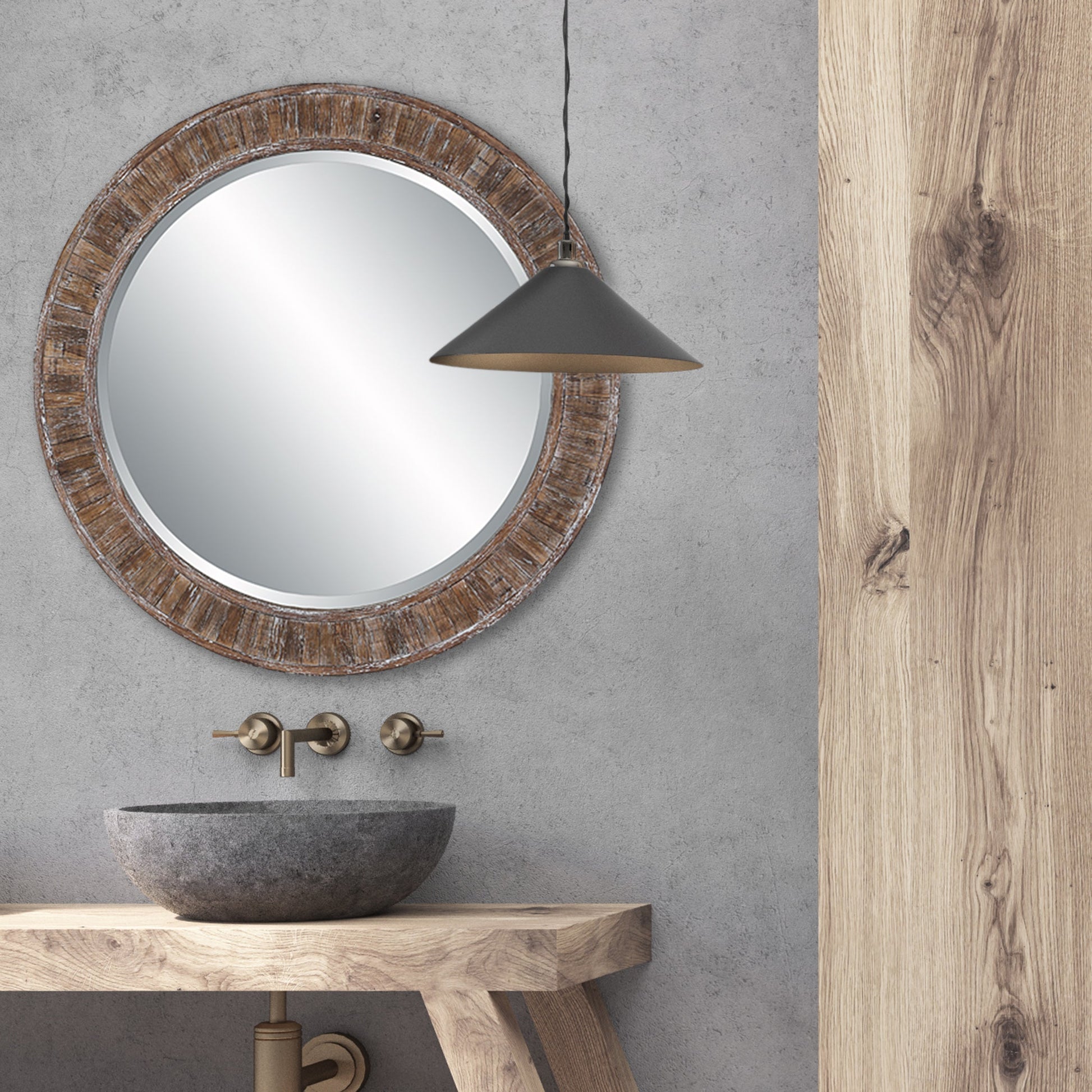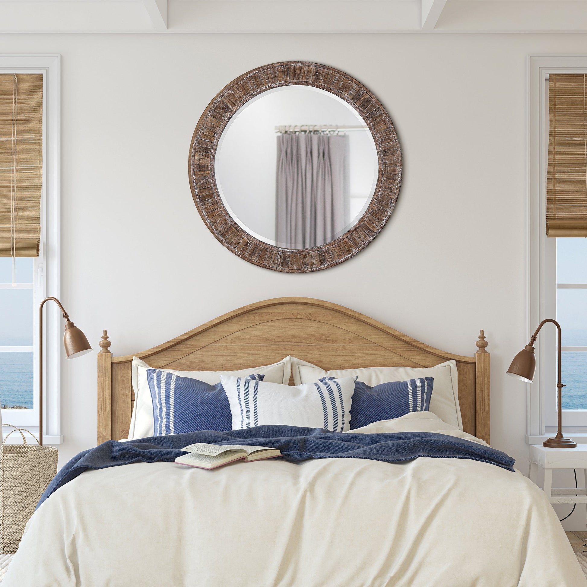 Details & OverviewStrips of darkened weathered pine, finished in a white distressing, give this 34" round frame an aged look, and is perfect for a mountain retreat or a house by the ocean. The mirror has a 1" bevel. Also available in a white distressed finish, W00548, and