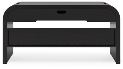 Details & OverviewInspired by art deco design, the softly shaped Rowanbeck home office desk makes a lasting impression in a simply stunning way. Its magnificent curved silhouette is enhanced by a rich layered black finish on the textured wood grain surface. Complete with ample storage, a pull-out keyboard tray and USB charging, this is the all-in-one piece you’ve been looking for to elevate your contemporary workspace decor.