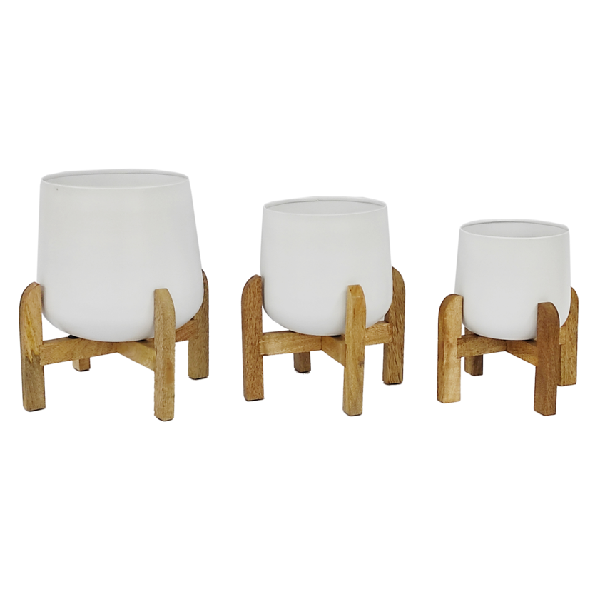 Details & Overviewأصيص زرع معدني S/3 مقاس 9/10/12 بوصة مع حامل خشبي، أبيض