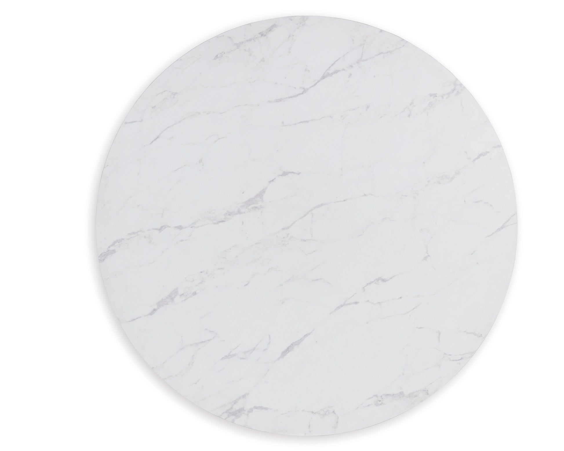 Clean lines meet cool curves with the Sawdyn dining table. Chunky round post legs and a natural finish lend a modern vibe, while a replicated white marble top completes the casual lifestyle design. What a delicious choice for a dining room update.