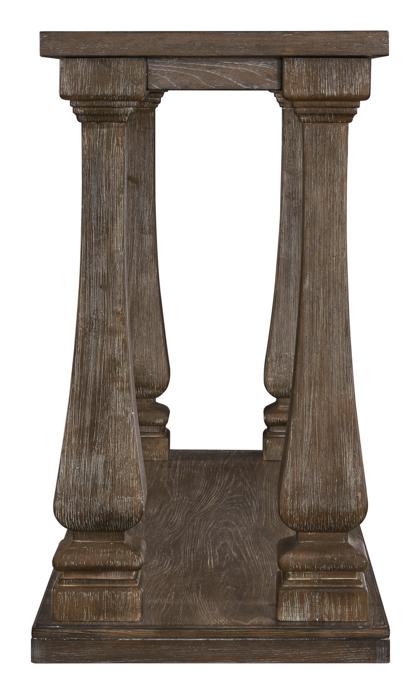 • Homey. Hearty. Heavenly hued. Luring with a distressed weathered gray finish and square baluster legs set on a broad lower shelf for great presence, the Johnelle sofa table is sure to make your homestead feel that much more like home. The look is beautified with elm veneers and a framed and plank-effect tabletop for a richly crafted masterpiece made for years of satisfaction.