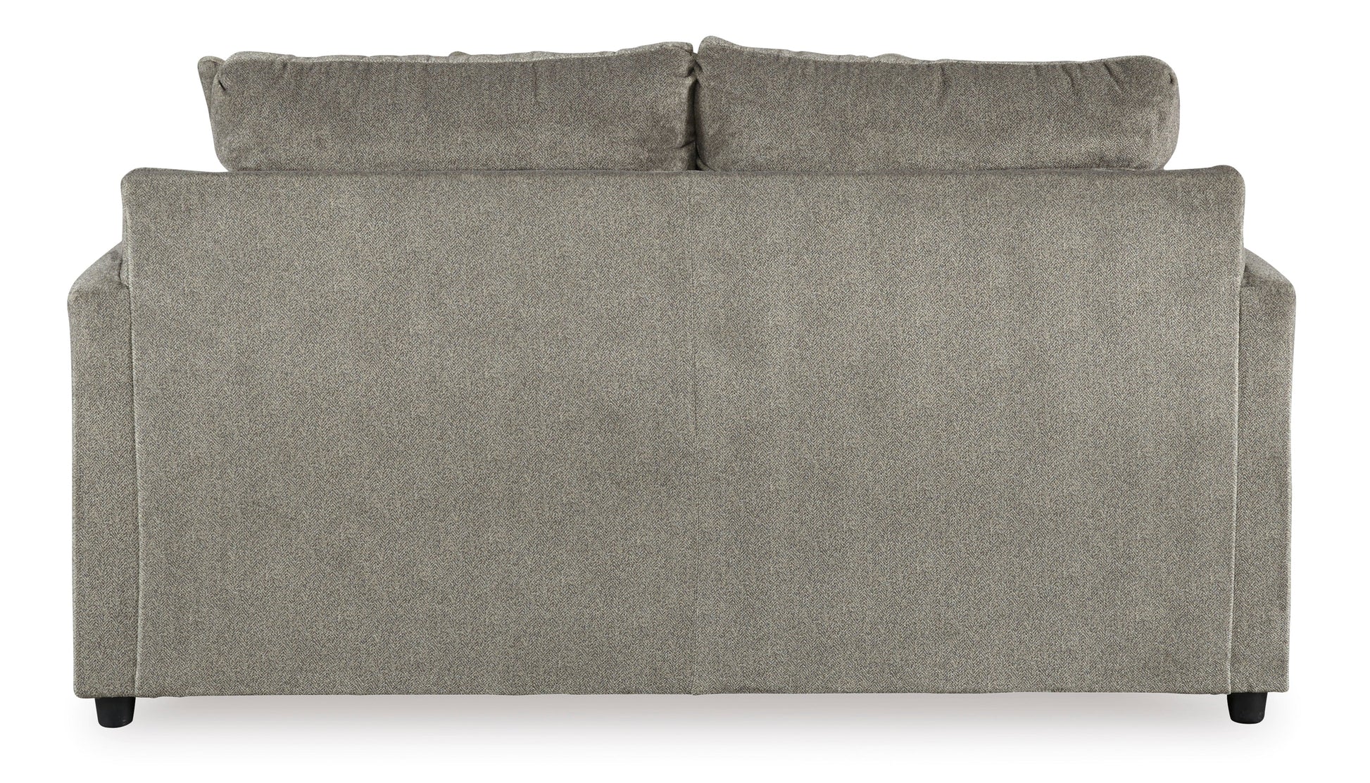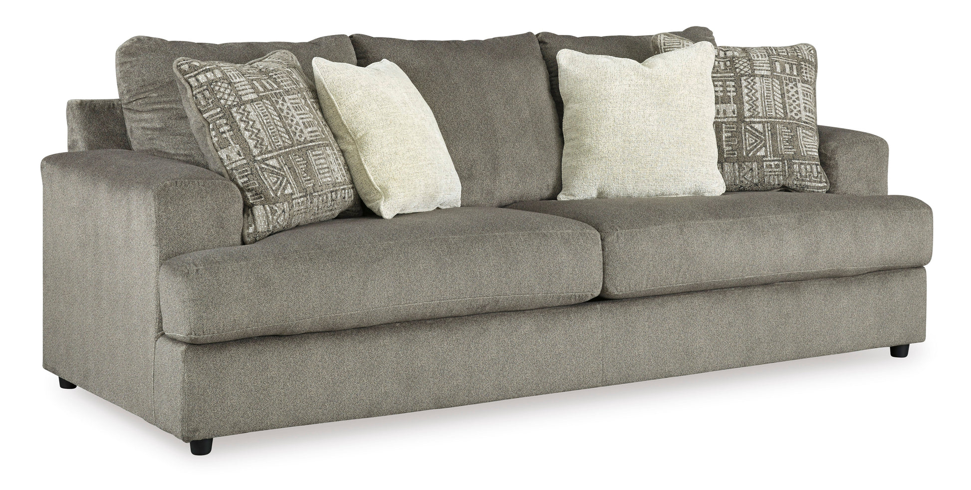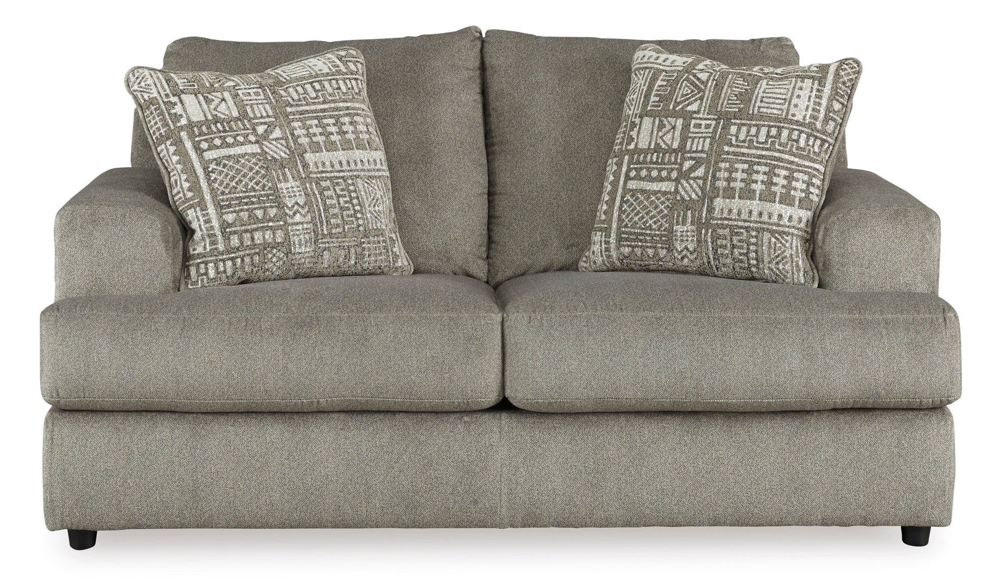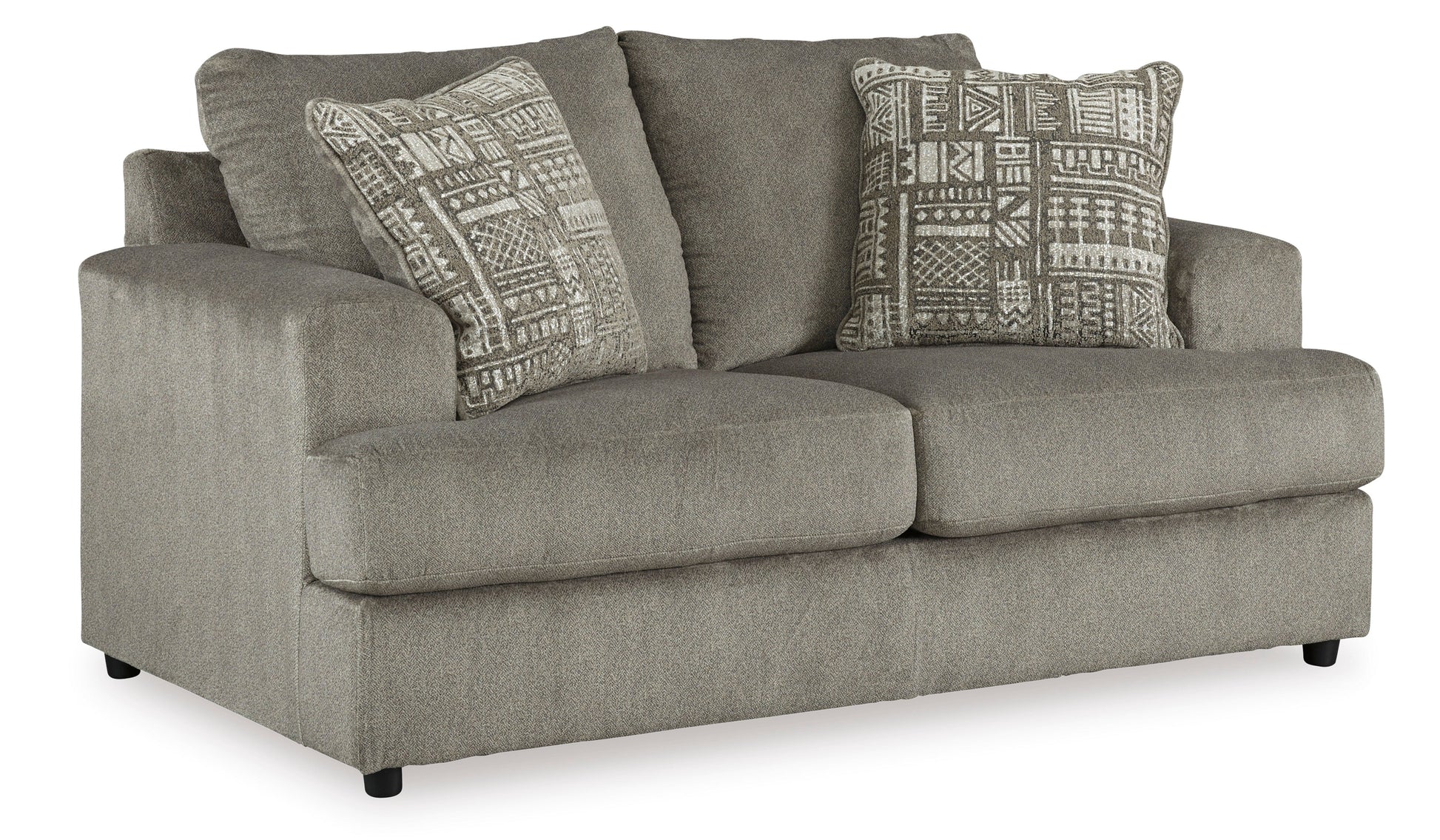 Flaunting a trendsetting silhouette, the Soletren loveseat puts the contemporary in your contemporary home. Its "three over two" profile eliminates the center seat cushion, giving you elongated plushness and deep seating. Microfiber fabric satisfies your need for a piece that feels as good as it looks. Accented with soft jacquard chenille throw pillows for a splash of geometric pattern and color contrast.