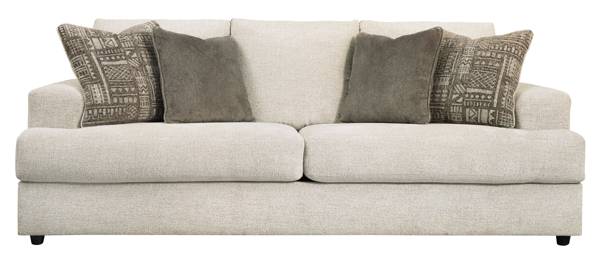 Flaunting a trendsetting silhouette, the Soletren sofa puts the contemporary in your contemporary home. Its “three over two” profile eliminates the center seat cushion, giving you elongated plushness and deep seating. Chunky chenille fabric satisfies your need for a piece that feels as good as it looks. Accented with soft jacquard chenille throw pillows for a splash of geometric pattern and color contrast.