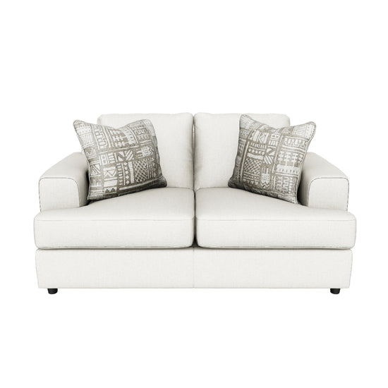 Flaunting a trendsetting silhouette, the Soletren loveseat puts the contemporary in your contemporary home. Its “three over two” profile eliminates the center seat cushion, giving you elongated plushness and deep seating. Chunky chenille fabric satisfies your need for a piece that feels as good as it looks. Accented with soft jacquard chenille throw pillows for a splash of geometric pattern and color contrast.